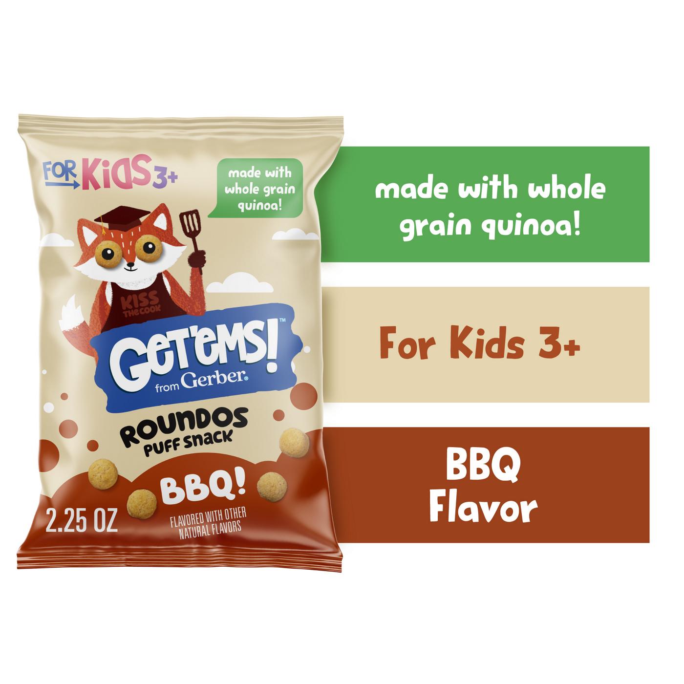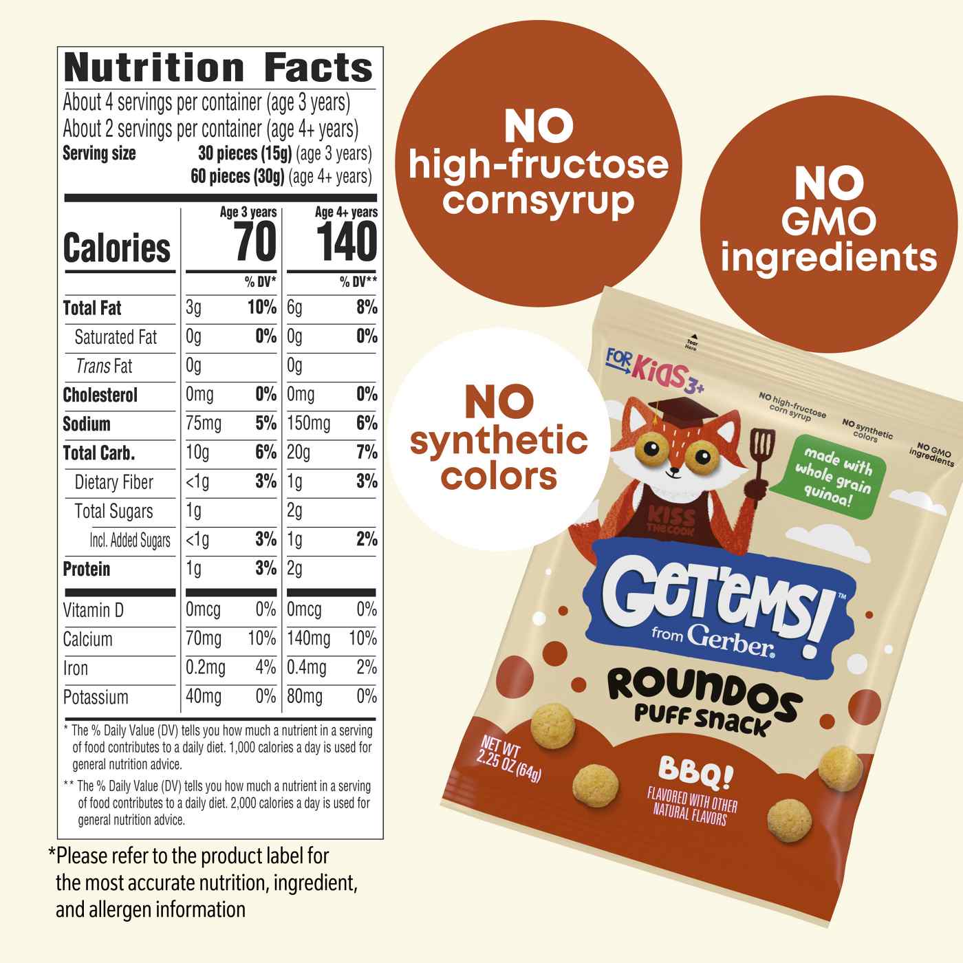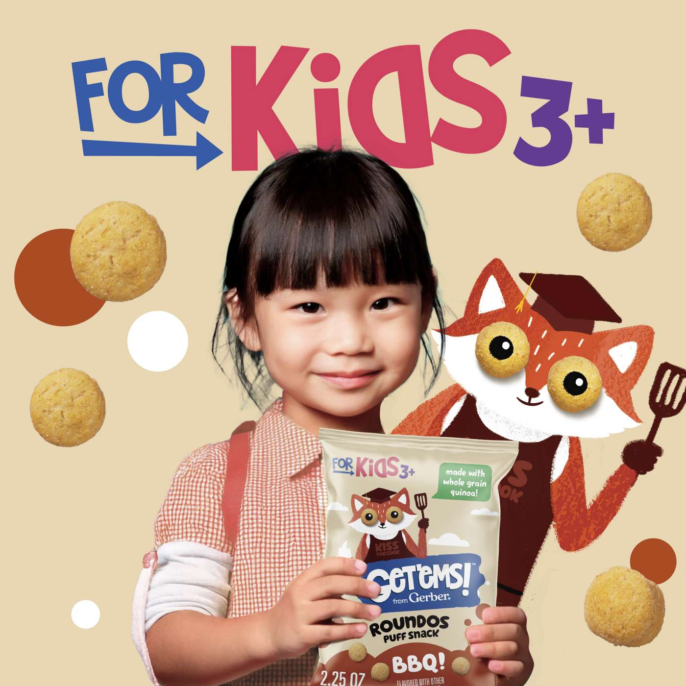 Introducing, GeT'eMS!™ from Gerber®. Who says nutrition can’t be fun? Get‘ems!™ is on a quest to help kids discover a whimsical new world of nutritious foods and delightful flavors that light up every child’s face with a big smile. Enriched with Calcium and made with real whole grain quinoa, our Roundos offer