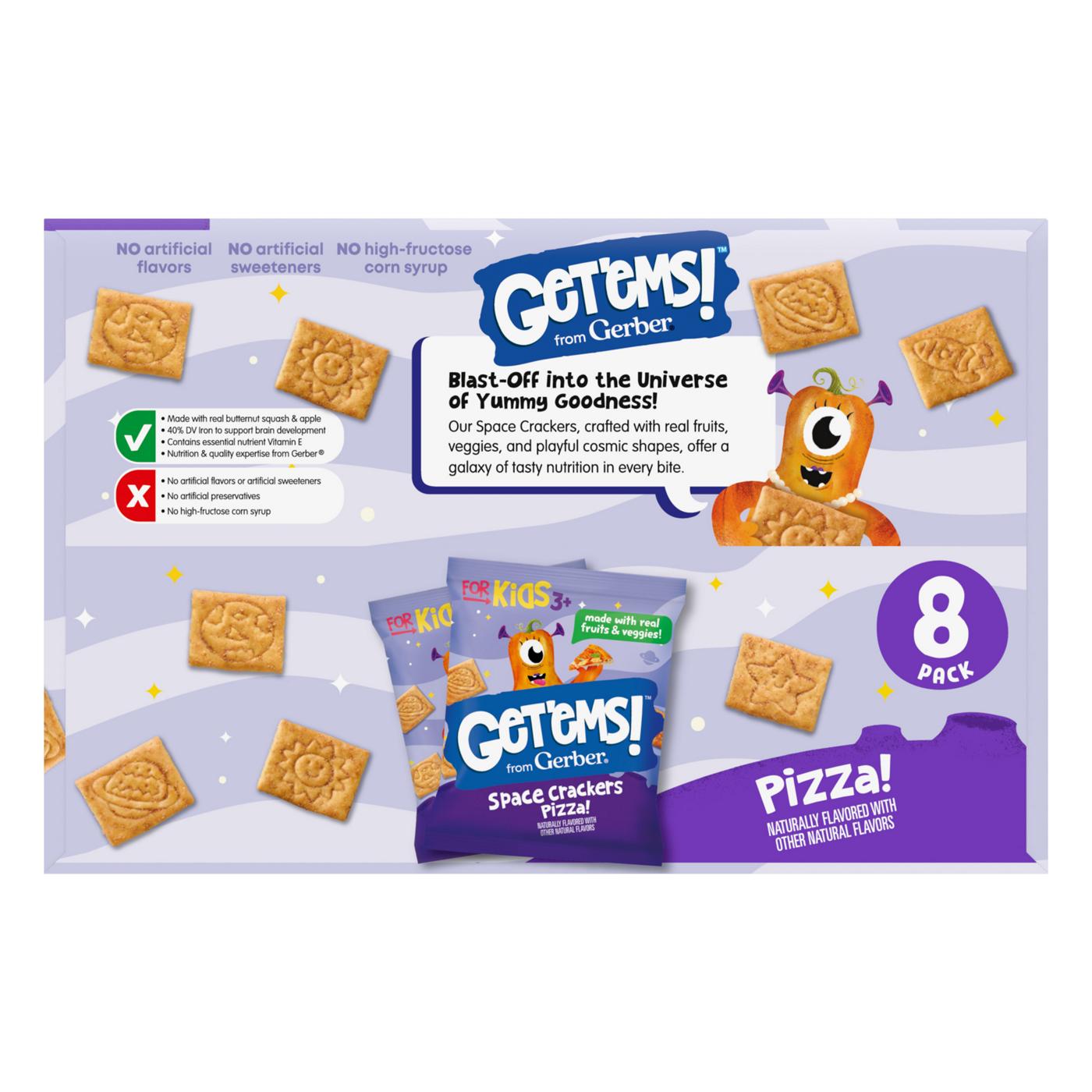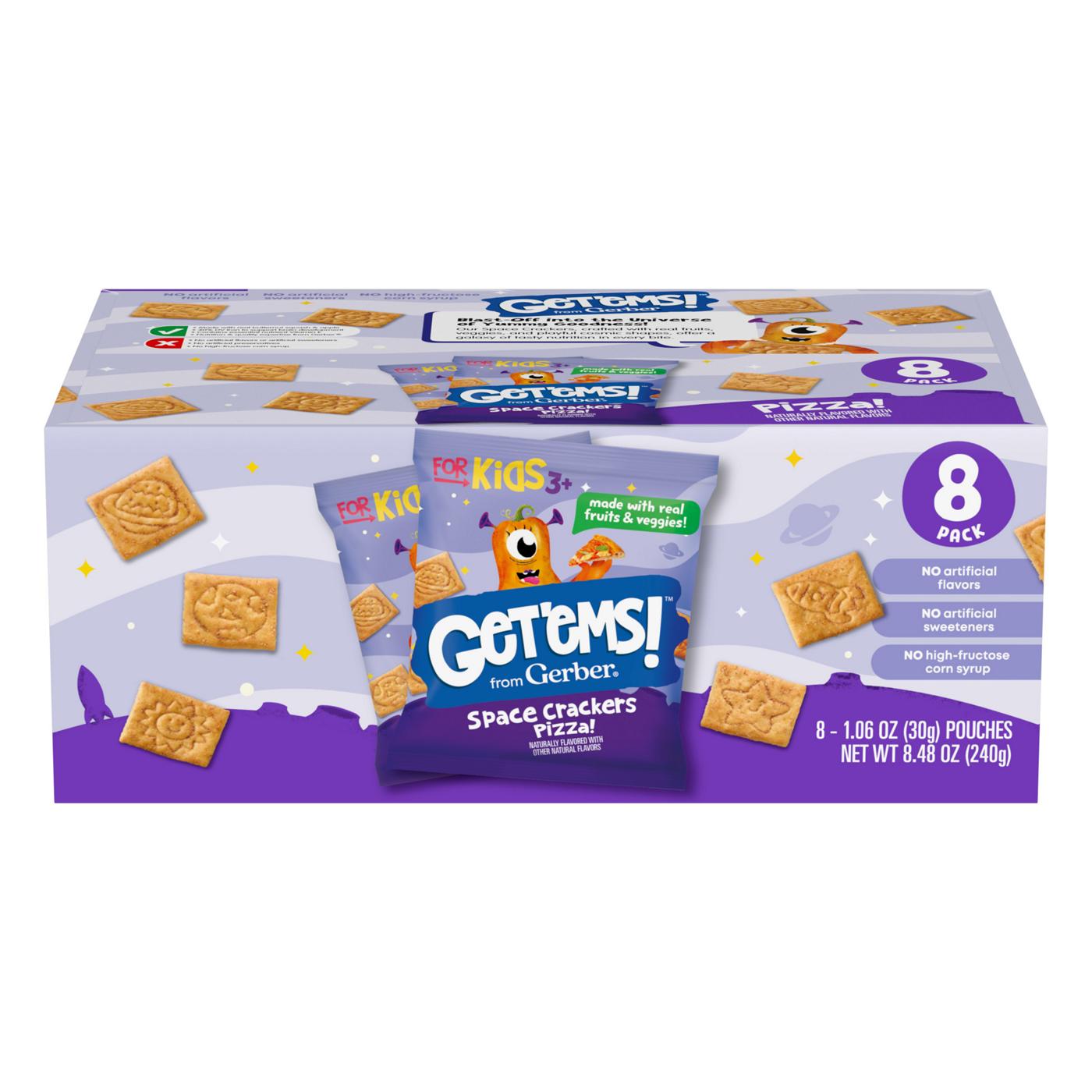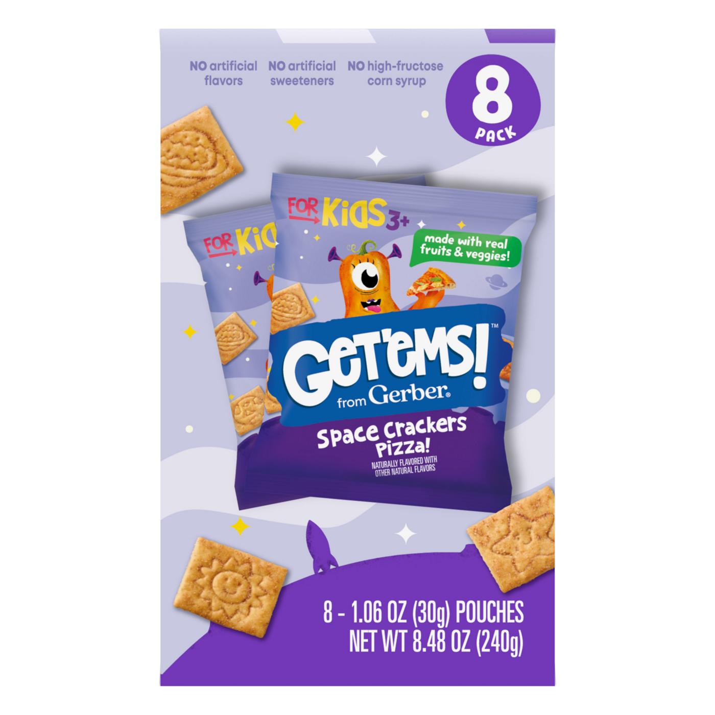 Now available in a snack size 8-pack, Gerber's Get'ems! Pizza Space Crackers offer a delightful mix of nutrition and fun for kids aged three and up. Crafted with real fruits and vegetables in playful cosmic shapes, these crackers provide 40% of the daily value of iron to support brain development and essential Vitamin E. Made with quality ingredients, they contain no artificial flavors, sweeteners, preservatives, or high-fructose corn syrup. Designed to make nutrition enjoyable, Get'ems! encourages kids to explore a whimsical world of tasty foods. Perfect for lunch boxes, these space-themed crackers deliver a delicious pizza flavor and a satisfying crunch, making them an exciting and nutritious snack for young adventurers.