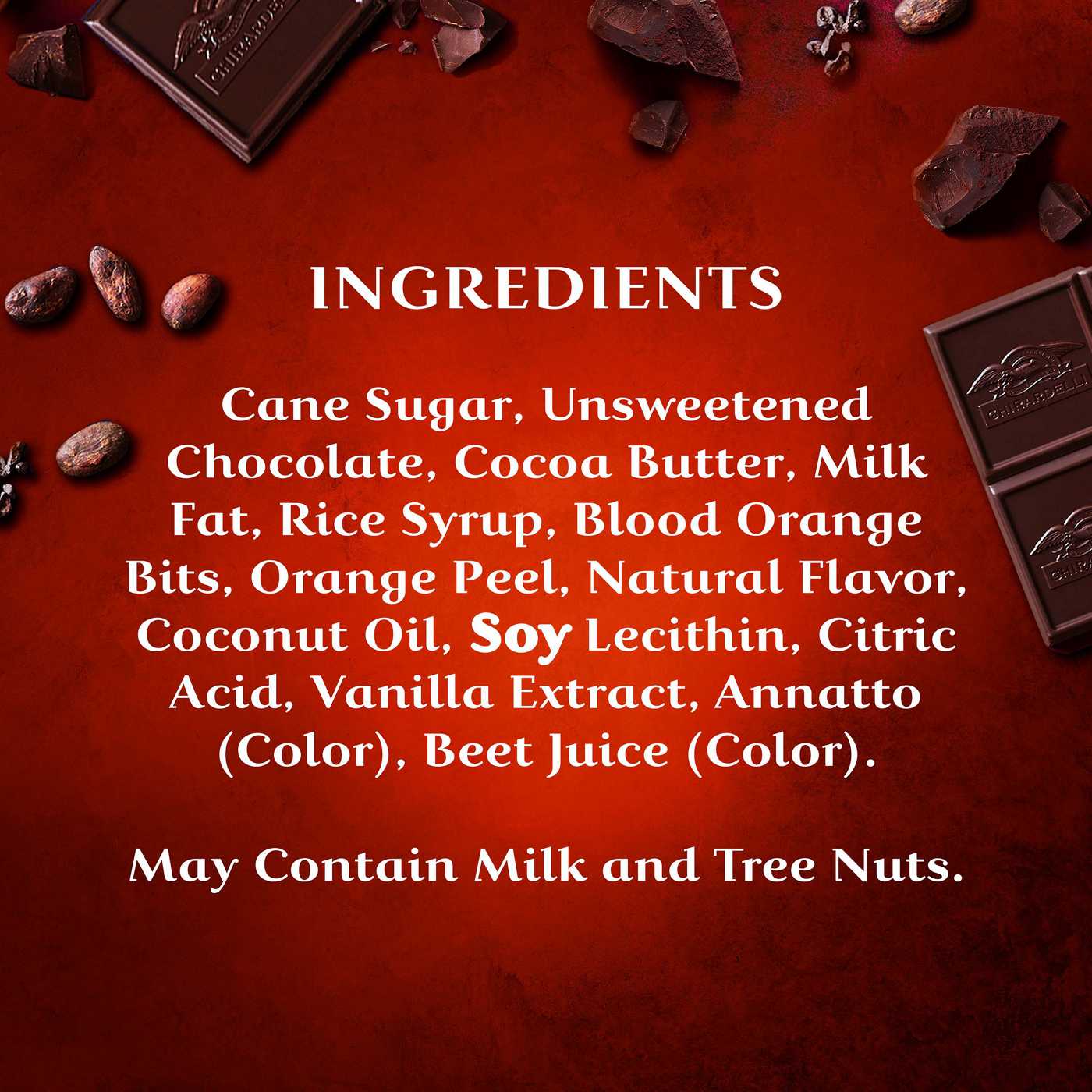 Cane Sugar, Unsweetened Chocolate, Cocoa Butter, Milk Fat, Rice Syrup, Blood Orange Bits, Orange Peel, Natural Flavor, Coconut Oil, Soy Lecithin, Citric Acid, Vanilla Extract, Annatto (Color), Beet Juice (Color).Allergens and safety warnings