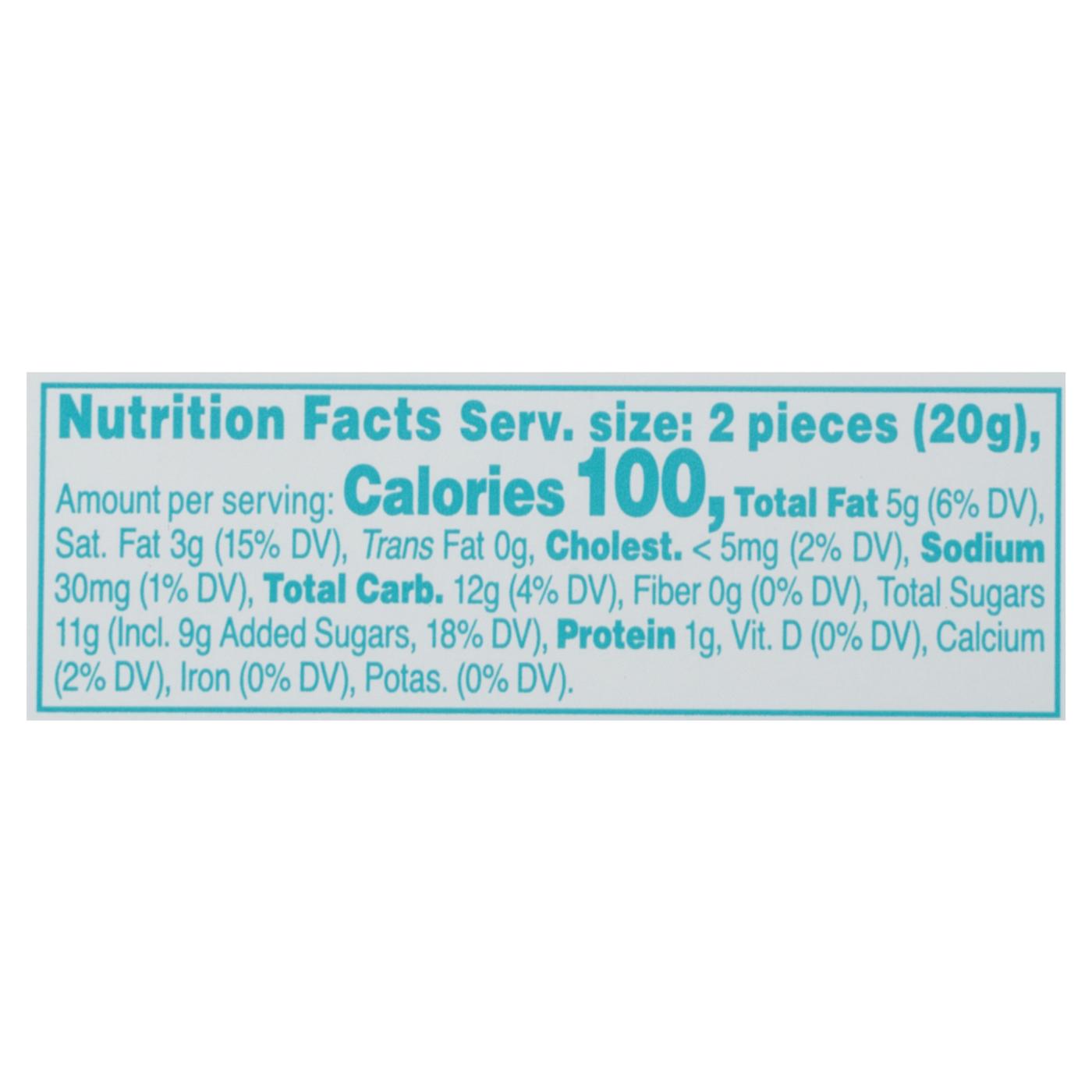 Sugar, Corn Syrup, Whole Milk Powder, Cocoa Butter, Sweetened Condensed Milk (Milk, Sugar), Unsweetened Chocolate, Palm Oil, Butter (Cream, Salt), Sodium Citrate, Natural Flavor, Soy Lecithin, Extracts of Oregano, Flaxseed, Plum, and Green Tea (to Preserve Freshness), Salt, Vanilla Extract.Allergens and safety warnings