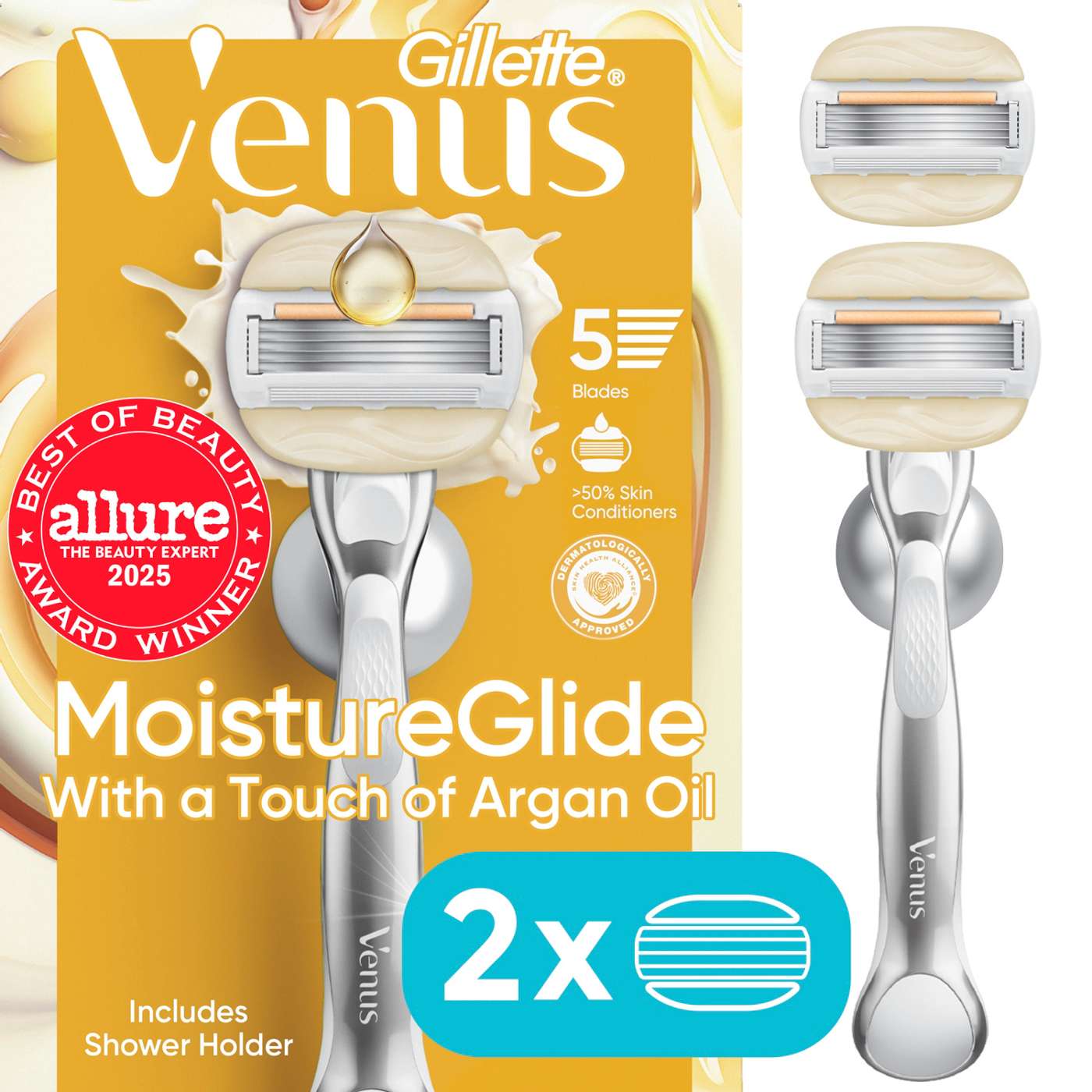 Don't compromise your dry skin with just any old razor. Give it the love it deserves with the Gillette Venus Moistureglide Razor for women. Designed specifically to care for even the driest skin, the Venus Moistureglide razor is dermatologically accredited, so you can get a worry-free, hydrating smooth that lasts. The 2-in-1 moisture bars, made with a touch of argan oil, both lathers and shaves in one stroke-no shave cream required! These 5-blade razor blades have a lubricating strip which glides over skin to help protect from shave irritation. Looking for extra control? We've got you covered: Our durable and ergonomic metal handle is weighted for better precision. The reusable handle is also compatible with any Venus razor cartridge refill*, and the included shower holder helps keep your razor clean and dry between shaves. Get a razor that gets your dry skin. Get Venus Moistureglide. Looking for even more ways to love your skin, your way? Gillette Venus products are made with your body and hair in mind, wherever you want to trim, shave, shape, or style. Explore the entire range of Venus products, from razors to shave gels to disposables to facial razors and more. *Except Simply Venus and Venus for Pubic Hair and Skin
