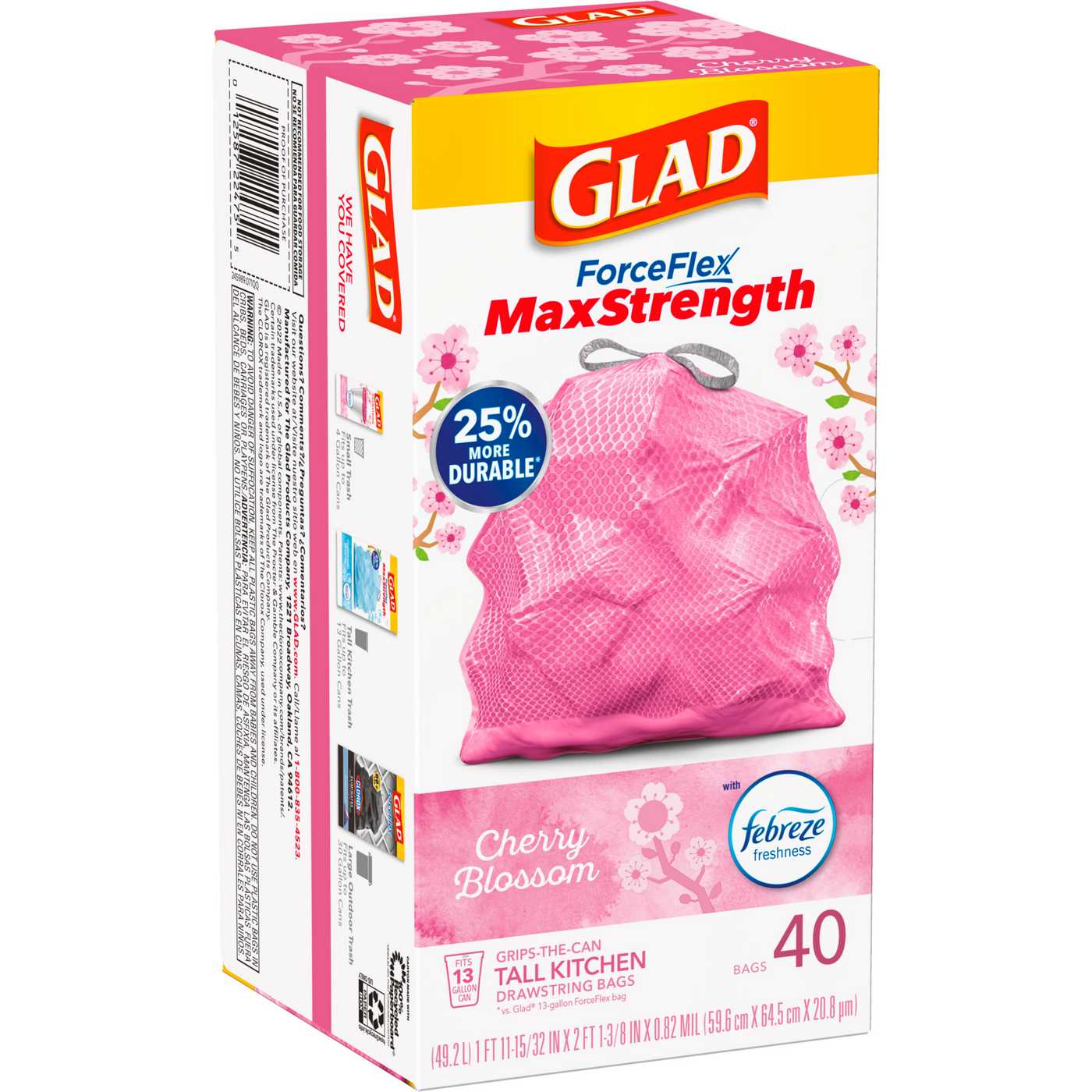 Glad ForceFlex MaxStrength Drawstring Kitchen Trash Bags are equipped with Febreze freshness and provide maximum strength to hold heavy trash loads.- TALL KITCHEN TRASH BAGS: Forty (40) 13-gallon Glad ForceFlex MaxStrength Drawstring Tall Kitchen Trash Bags in Cherry Blossom with Febreze Freshness- MAXSTRENGTH FORCEFLEX TRASH BAGS: 25% more durable* tall kitchen garbage bags feature an outer leak protection layer and an inner layer that stretches to prevent rips and tears- LEAK PROTECTION: Glad kitchen trash bags designed with double side seals and a reinforced bottom to uniquely trap liquids and prevent leaks- SCENTED GARBAGE BAGS: Cherry Blossom scent with Febreze freshness works to trap odors and help eliminate garbage smells in the kitchen, while the pretty pink color adds an aesthetic touch- GRIPS-THE-CAN DRAWSTRING: Durable 3-ply drawstring grips the can so the garbage bag stays in place and makes it easy to close and carry out the trash with no fear of leaks or tears