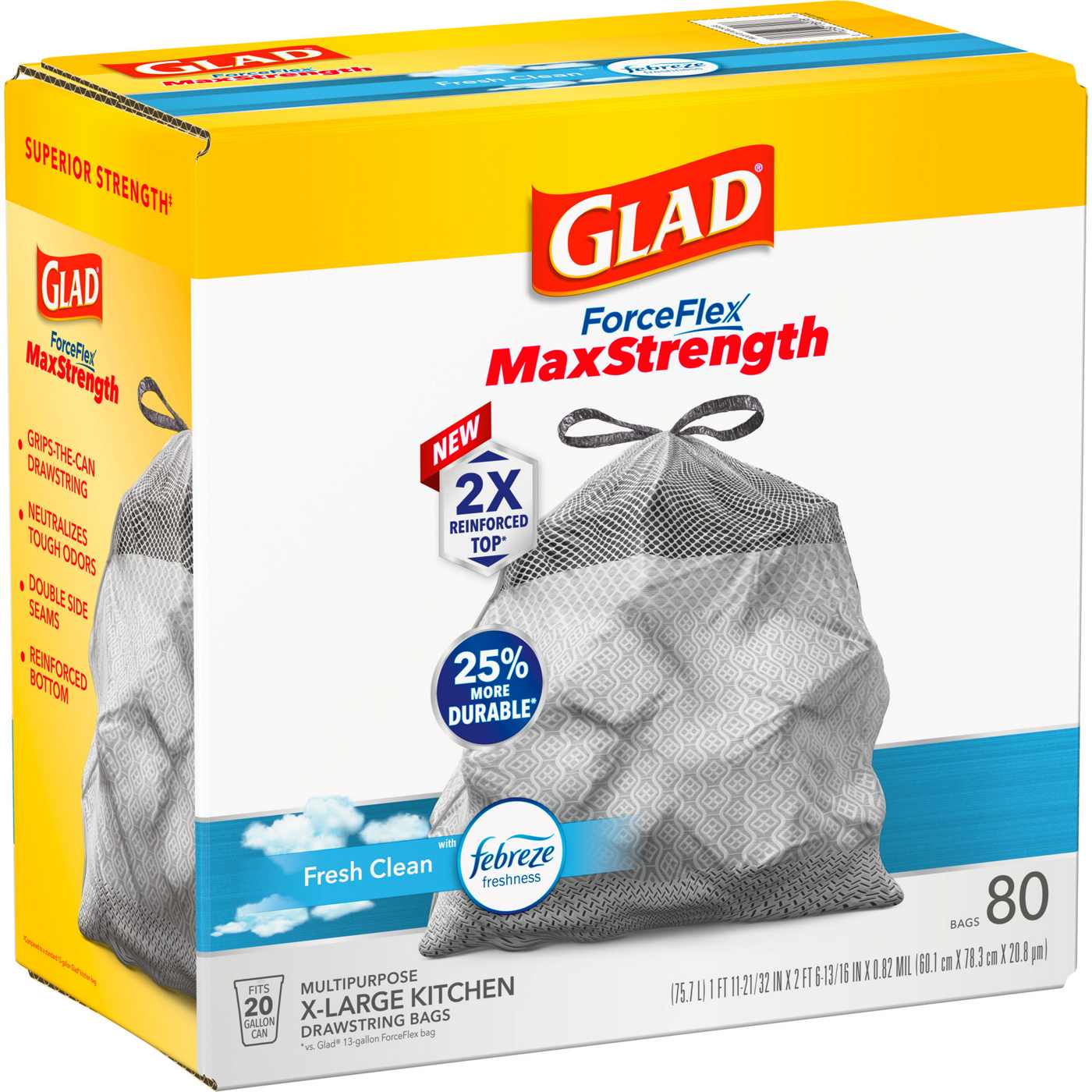 Glad ForceFlex MaxStrength X-Large Kitchen Trash Bags are equipped with Febreze freshness and offer maximum strength to handle heavy trash loads.- DRAWSTRING TRASH BAGS: Eighty (80) 20-gallon Glad ForceFlex MaxStrength Drawstring X-Large Kitchen Trash Bags in Fresh Clean With Febreze Freshness- MAXSTRENGTH FORCEFLEX TRASH BAGS: 25% more durable* extra large garbage bags feature an outer leak protection layer and an inner layer that stretches to prevent rips and tears- LEAK PROTECTION: Glad extra large trash bags designed with double side seams and a reinforced bottom to uniquely trap liquids and prevent leaks- REINFORCED TOP: The 2X reinforced top* helps prevent rips and tears at the top of the bag when you pull it out of the trash can and carry it out- SCENTED GARBAGE BAGS: Kitchen garbage bags feature Fresh Clean scent with Febreze Freshness to help neutralize and eliminate trash odors in the kitchen