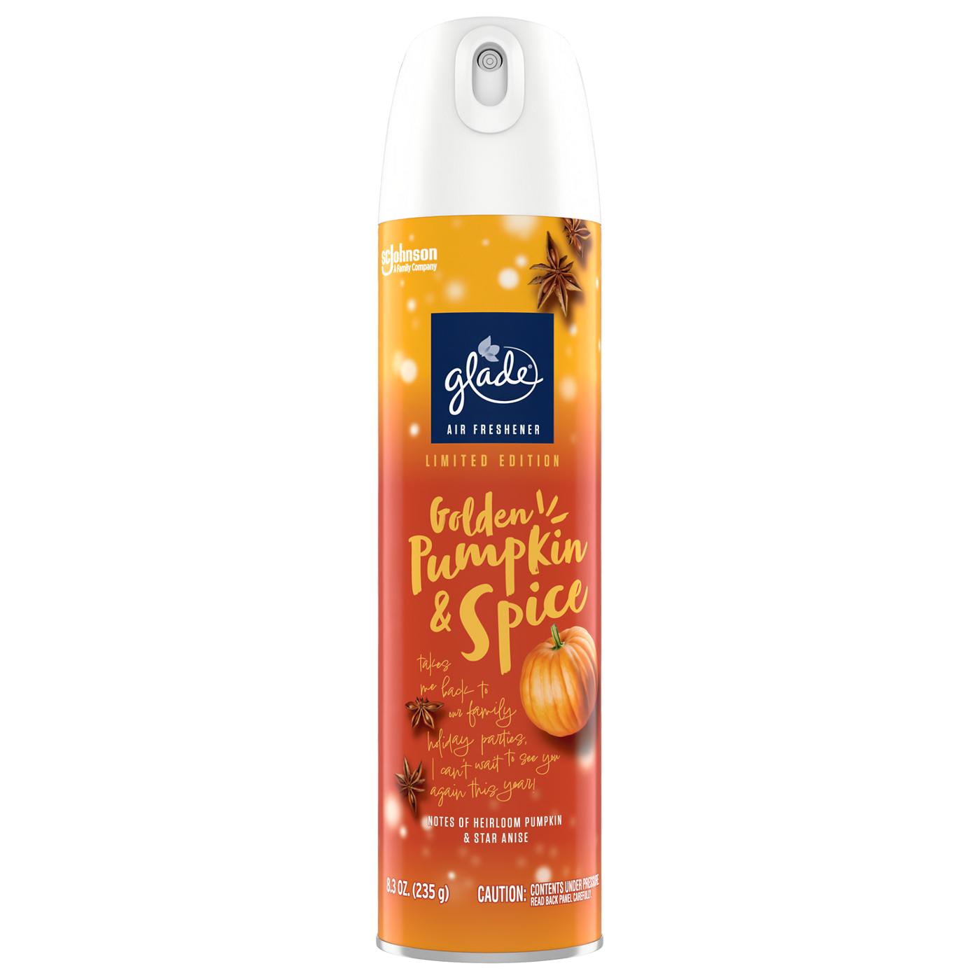 Turn up the season with Glade Golden Pumpkin & Spice air freshener for home. This limited edition spray air freshener is a great way to add a little luxurious comfort to any gathering with fall scents and inviting fragrances. This Glade Golden Pumpkin & Spice air freshener spray fills any room with a blend of pumpkin, star anise and cinnamon. Glade fall scents are crafted by master perfumers and include fragrance infused with essential oils. This Golden Pumpkin & Spice air freshener spray is perfect as an air freshener for rooms anywhere in your home, even your bathroom. The Glade Holiday Glow Collection is a range of limited-time-only Glade scents that will get you in the mood to indulge in luxurious comfort.