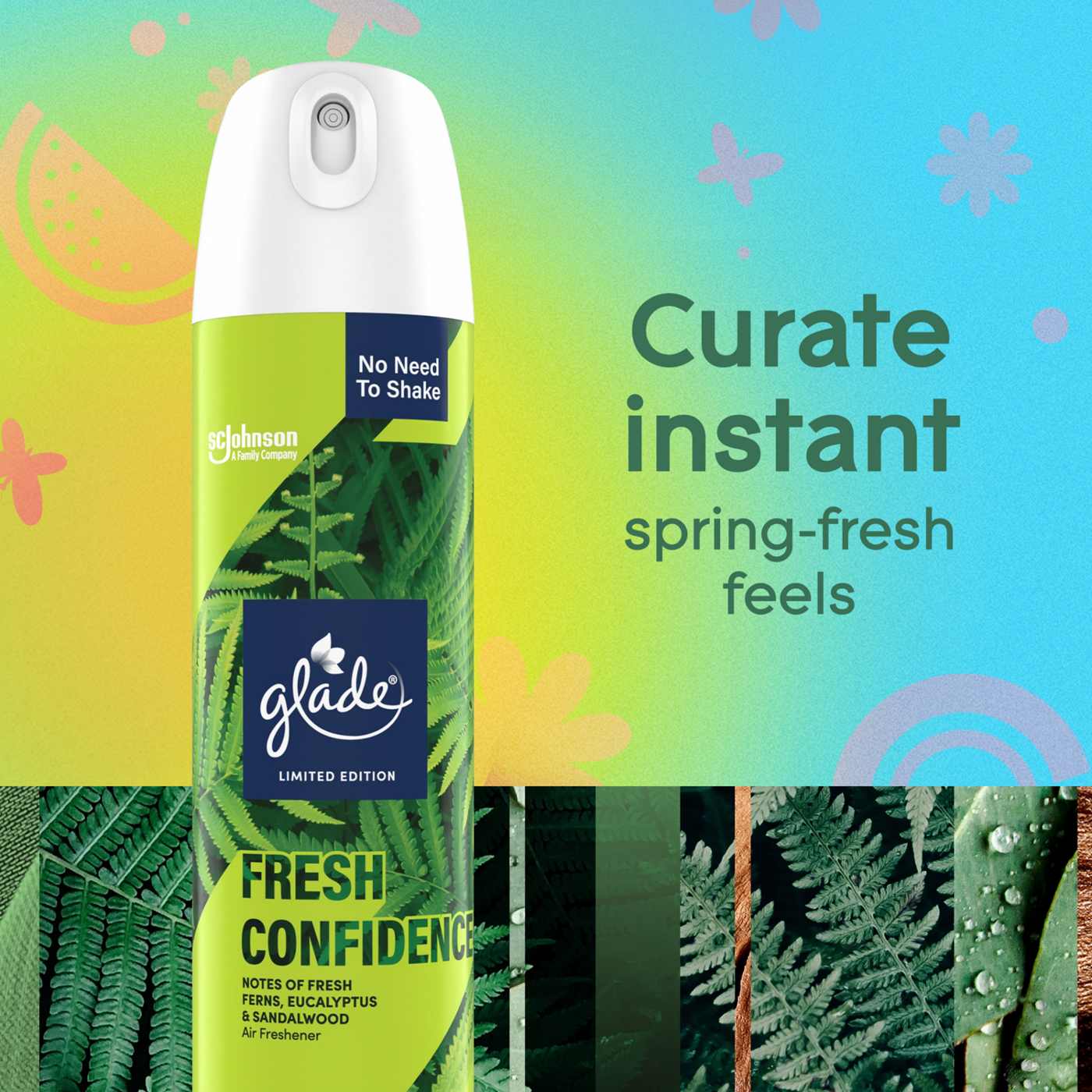 Spring into a refreshing experience with Glade air freshener spray made with Limited Edition Fresh Confidence fragrance. Add a defining flair to any space with scents of fresh ferns, eucalyptus and sandalwood.