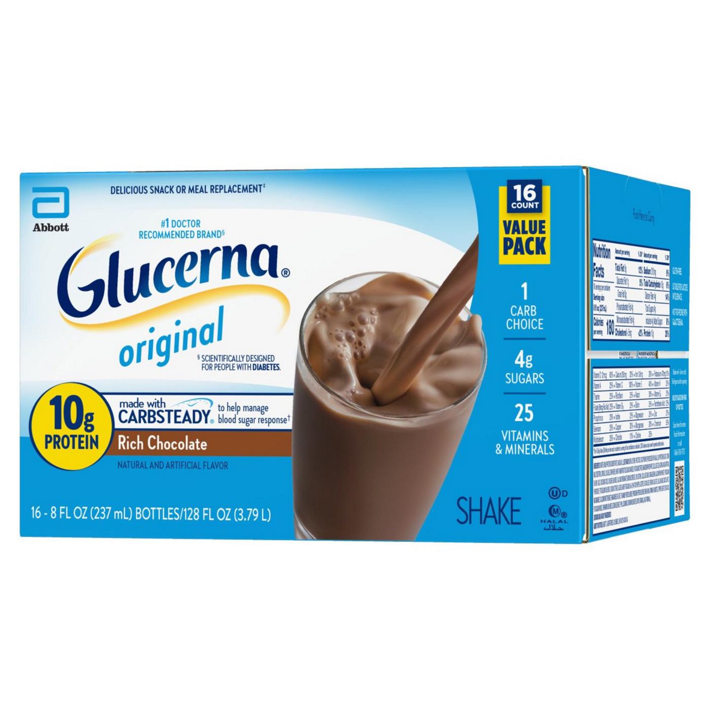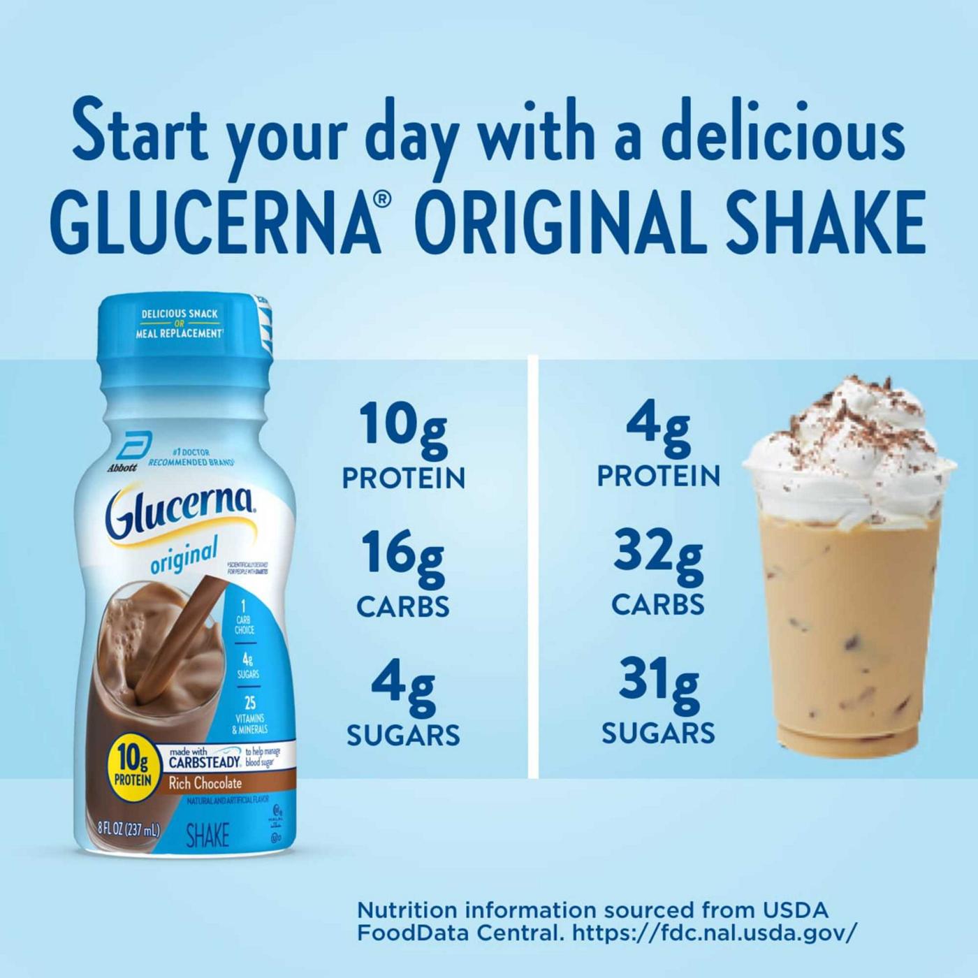 Glucerna Original shakes are scientifically designed to help people with diabetes and prediabetes manage blood sugar response.* They are made with CARBSTEADY, a unique blend of low-glycemic carbohydrates to help manage blood sugar response,* as well as 10g of protein to support muscle and help manage hunger. Glucerna Original shakes have 25 vitamins and minerals, 4g sugars, 1 carb choice, and nutrients to support immune system health.† A delicious small meal or snack, they’re suitable for lactose intolerance,‡ and gluten-free. Glucerna is the #1 doctor-recommended nutrition brand for people with diabetes. * Designed to help minimize the blood sugar spike from consuming Glucerna compared to high-glycemic carbohydrates. † Nutrients include protein, vitamins A & D, zinc, and antioxidants (vitamin C & E and selenium). ‡ Not for people with galactosemia.