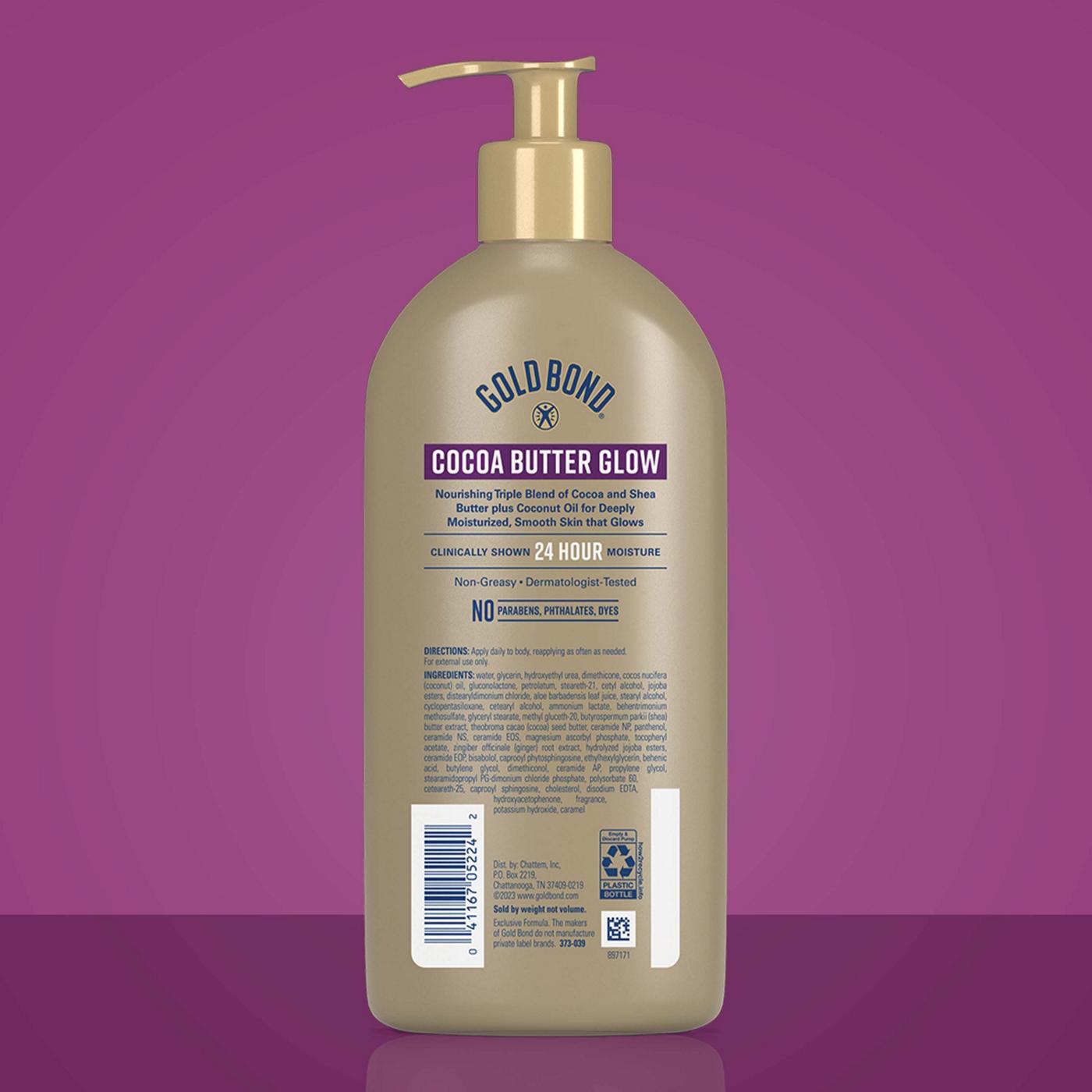 • Contains: One (1) 14-ounce pump bottle of Gold Bond Cocoa Butter Glow Daily Hydrating Lotion for dry skin