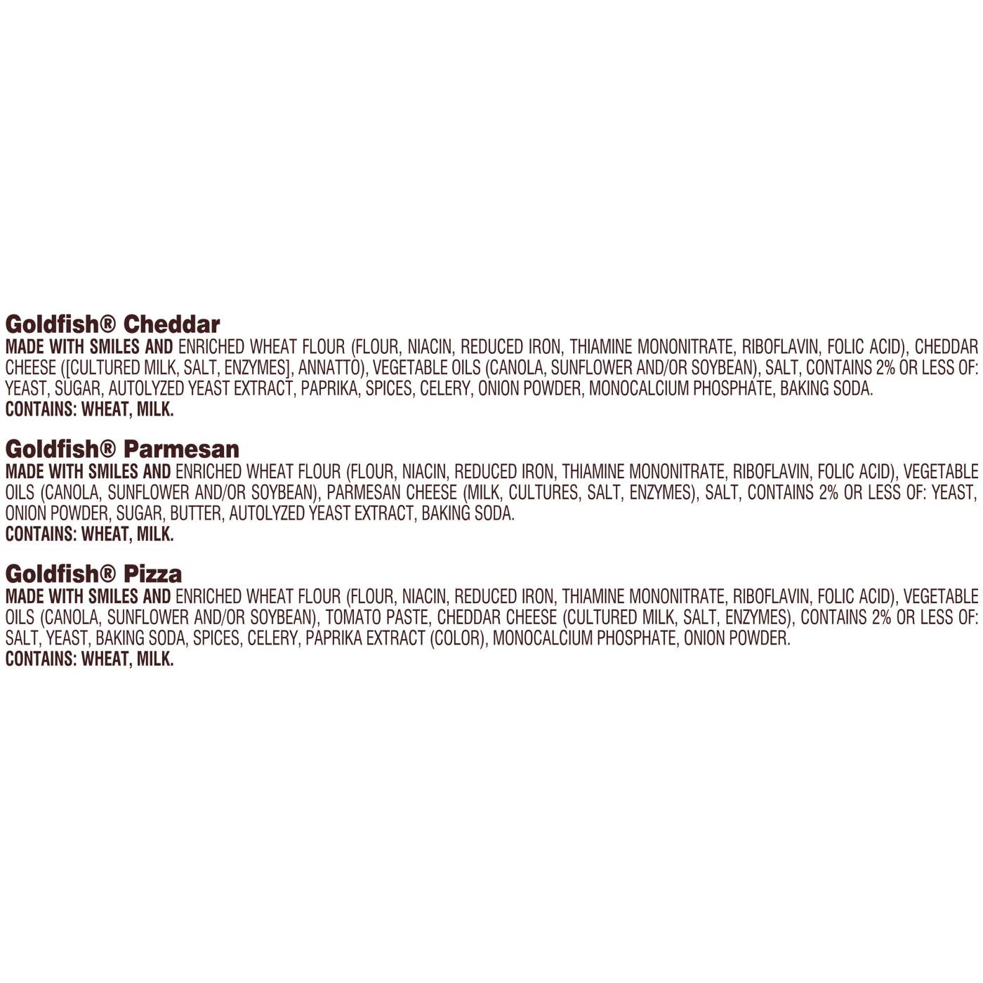 Say Cheeeese variety pack of Goldfish crackers includes all the cheesy favorites: Goldfish Pizza, Goldfish Cheddar and Goldfish Parmesan. They’re always baked with real cheese, and are made with no artificial flavors or preservatives. These munchable, crunchable little snack packs are perfect for on-the-go snacking. Go for the handful!VARIETY PACK INCLUDES: 6 snack packs of Goldfish Pizza, 8 packs of Goldfish Cheddar, 6 packs of Goldfish ParmesanALWAYS BAKED, NEVER FRIED: Munchable, crunchable Goldfish crackers are an anytime snack everyone can feel good aboutMADE WITH REAL CHEESE: This irresistible little snack is made with real cheese and no artificial flavors or preservativesCONVENIENT PACK SIZE: Single-serving packs are perfectly portioned for a lunch side or a munchable snack on the goPERFECT FOR SHARING: 20 count Say Cheeeese Goldfish variety pack lets friends and family choose their favorite flavorGO FOR THE HANDFUL: Grab a handful from these 0.9 oz snack bags of Goldfish cheese crackers