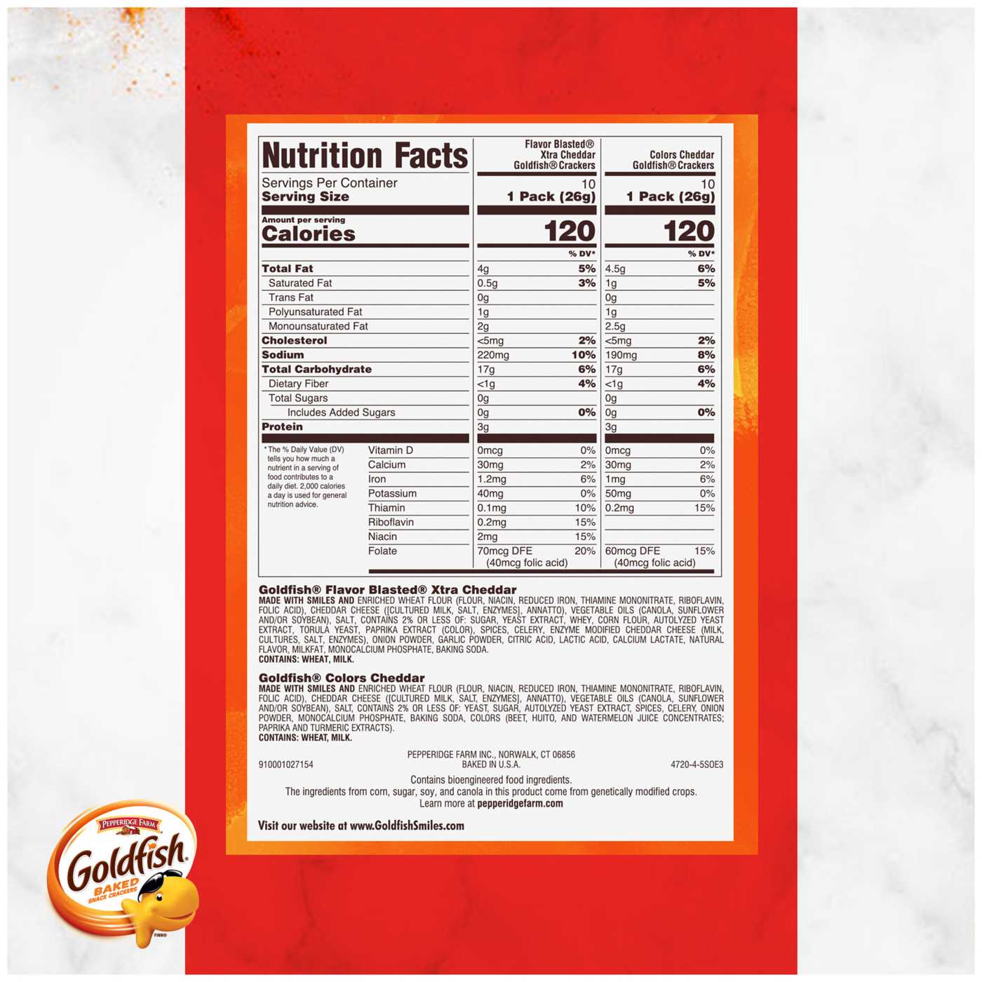 When it comes to snacking, there are a lot of ways to enjoy Goldfish snack crackers. This 20-count Dynamic Duo Variety Pack comes with 10 single-serving packs of Goldfish Colors Cheddar crackers as well as 10 single-serve snack packs of Goldfish Flavor Blasted Xtra Cheddar crackers (0.9 oz each). Both varieties are super munchable snacks that are easy to enjoy whether you’re at home or out and about. Go for the handful!VARIETY PACK INCLUDES: 10 single-serving packs of Goldfish Colors and 10 packs of Goldfish Flavor Blasted Xtra Cheddar crackersALWAYS BAKED, NEVER FRIED: Goldfish crackers are always baked and made with no artificial flavors or preservativesFLAVORFUL FUN: Made with real cheese for an oh-so-crunchable, munchable snackKEEP GOLDFISH WITHIN REACH: From after-school snacking to on-the-go get-togethers, take all your favorite Goldfish flavors with you in individual snack packs20 SNACK PACKS: The convenient multi-pack box gives you 20 0.9 ounce snack bags of Goldfish cheese crackers, so you have plenty to shareGO FOR THE HANDFUL: Goldfish crackers have the flavor that keeps families coming back for more