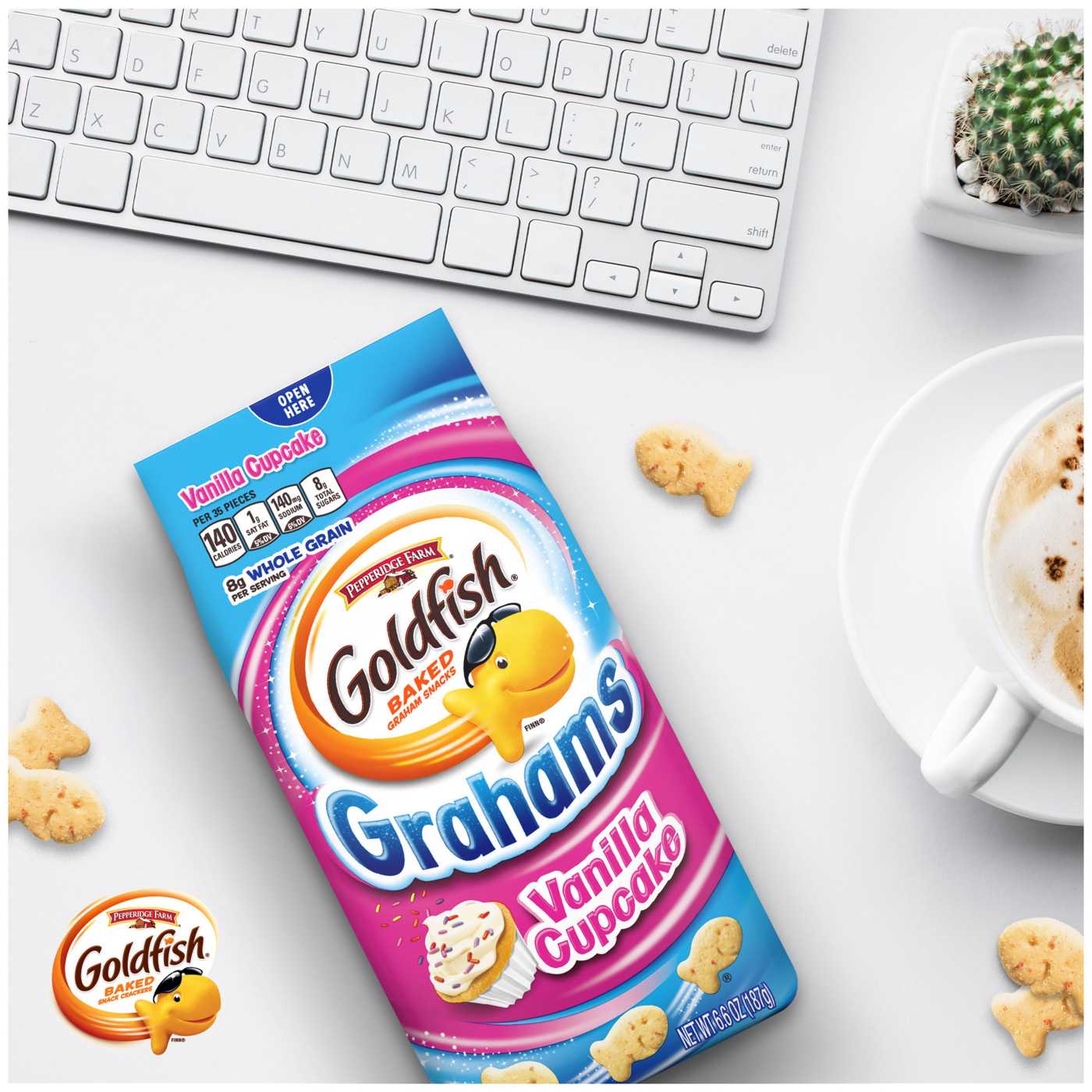 Enjoy snack-time goodness with delightfully munchable Goldfish Grahams Vanilla Cupcake snack crackers. These grahams hit the spot with a sweet and baked vanilla cupcake flavor. Baked with no artificial flavors or preservatives and with 8 grams of whole grain per serving, feel good about enjoying these playful snacks, anytime. Go for the handful!Includes one (1) 6.6-ounce bag of Goldfish Vanilla Cupcake Grahams snack crackersSweet and baked vanilla cupcake flavor8 grams of whole grain per servingBaked with no artificial flavors or preservativesGo for the handful