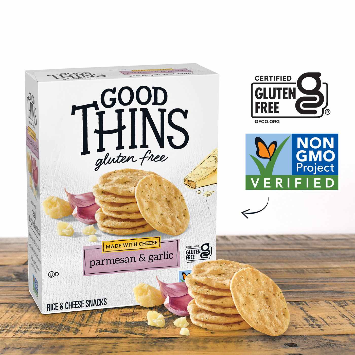 Enjoy a wholesome snack anytime, anywhere with GOOD THINS Parmesan & Garlic Rice & Cheese Snacks Gluten Free Crackers. Crafted with rice and cheese, these snack crackers are made with delicious goodness baked in every bite, and they're flavored with parmesan and garlic for a simply delicious snack. These round rice and cheese crackers are certified Gluten-Free by GFCO, Non-GMO Project Verified, and contain no artificial colors, artificial flavors, cholesterol or high fructose corn syrup.