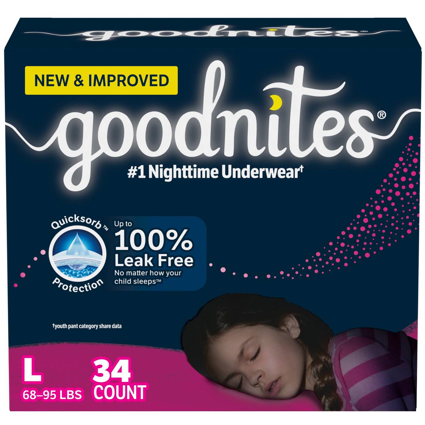 • Goodnites Girls' Nighttime Bedwetting Underwear: 34 overnight underwear for girls, size large; fits children 68-95 lbs• The Leading Nighttime Underwear* (*Youth Pant category share data)• Each bedwetting underwear features Quicksorb Protection for up to 100% leak free night• Goodnites are clinically proven for a better night’s sleep** (**vs. not using absorbent underwear• Goodnites holds three water bottles*** (***Three 8 oz bottles of saline, 24 oz. saline total)• Protection where girls need it the most• Free of harsh ingredients and hypoallergenic• Goodnites are FSA/HSA-eligible in the US