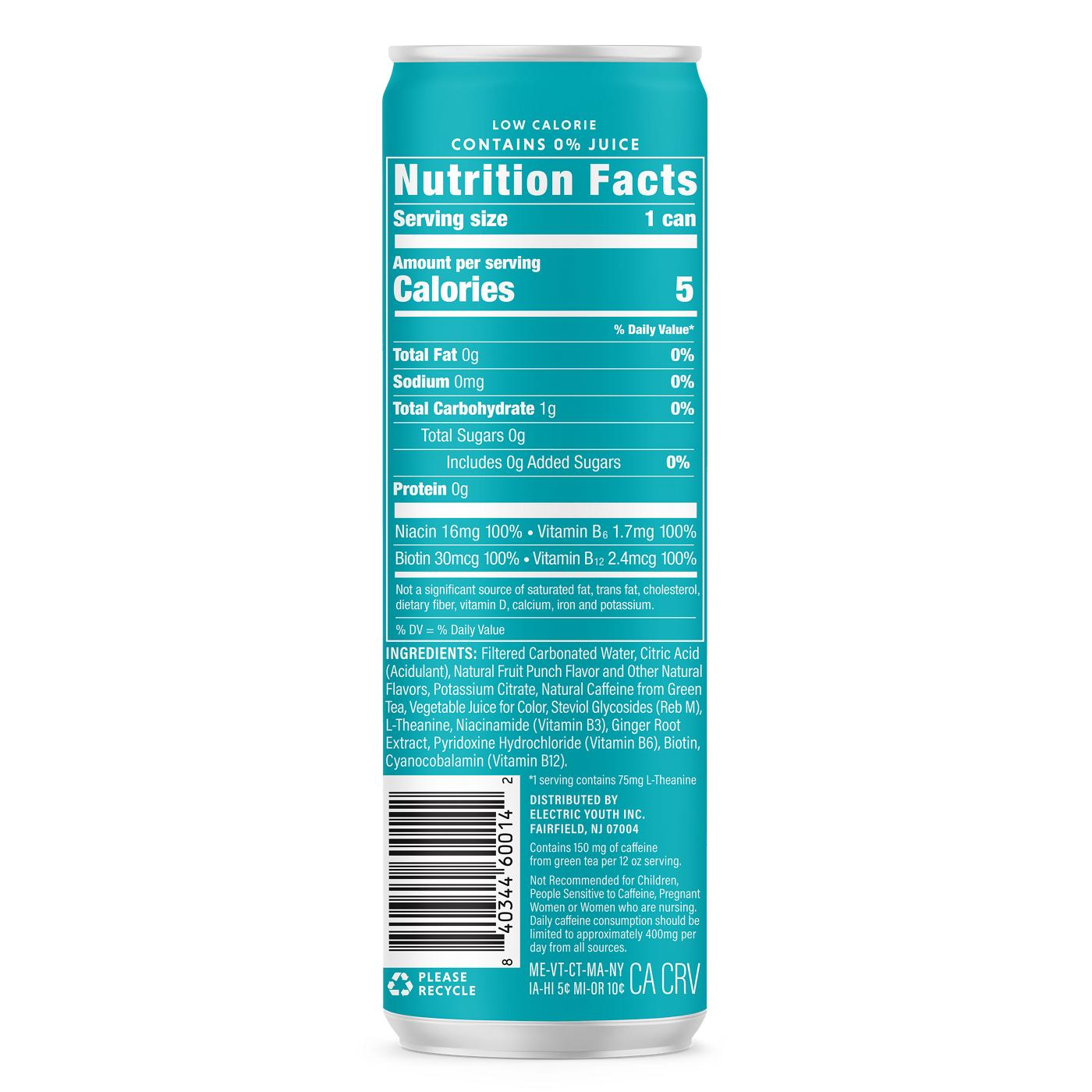 Filtered Carbonated Water, Citric Acid (Acidulant), Natural Fruit Punch Flavor with Other Natural Flavors, Potassium Citrate, Natural Caffeine from Green Tea, Vegetable Juice for Color, Steviol Glycosides (Reb M), L-Theanine, Niacinamide (Vitamin B3), Ginger Root Extract, Pyridoxine Hydrochloride (Vitamin B6), Biotin, Cyanocobalamin (Vitamin B12).Allergens and safety warnings