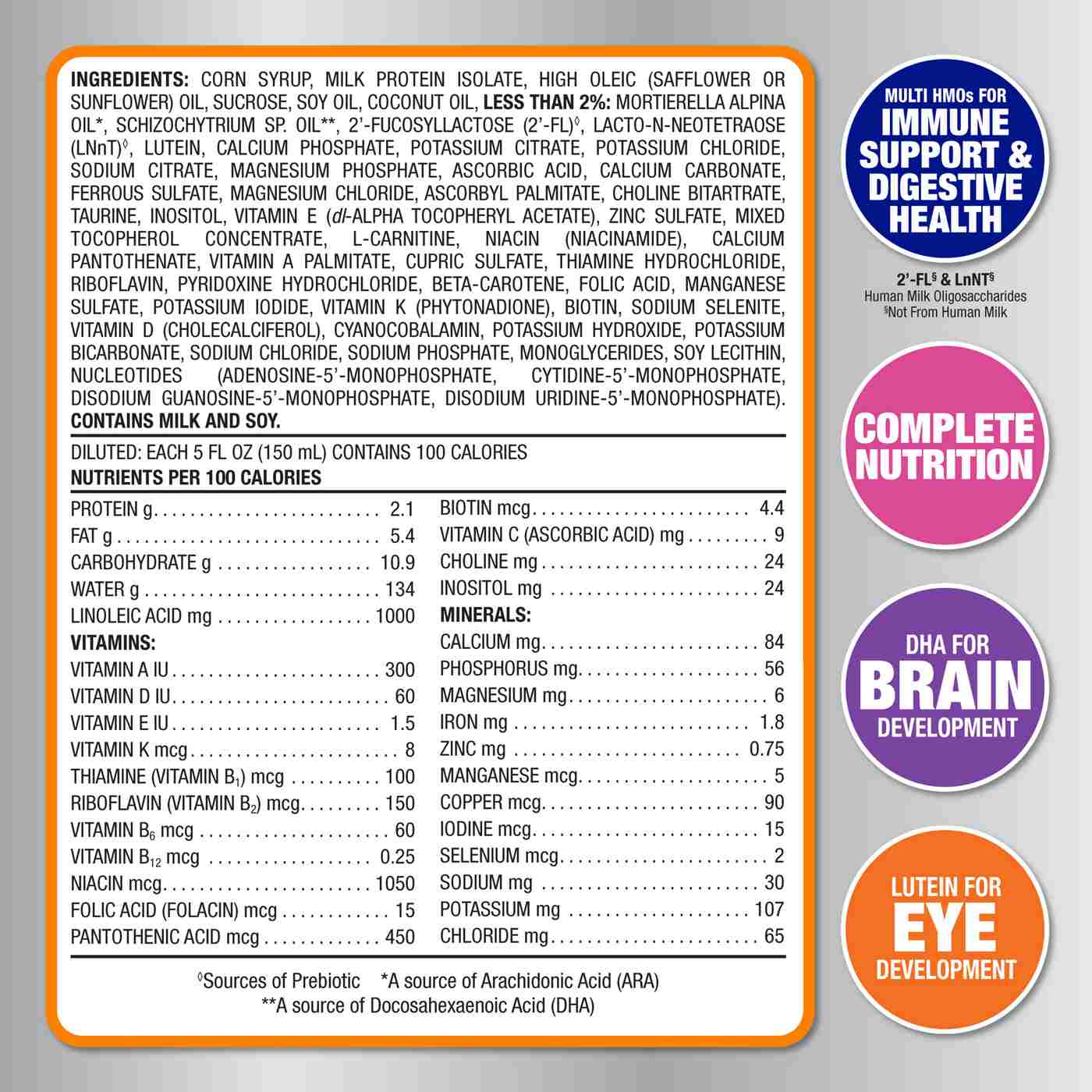 Corn Syrup, Milk Protein Isolate, High Oleic (Safflower Or Sunflower) Oil, Sucrose, Soy Oil, Coconut Oil, Less Than 2%: Mortierella Alpina Oil*, Schizochytrium Sp. Oil**, 2'-Fucosyllactose (2'-Fl), Lacto-N-Neotetraose (Lnnt), Lutein, Calcium Phosphate, Potassium Citrate, Potassium Chloride, Sodium Citrate, Magnesium Phosphate, Ascorbic Acid, Calcium Carbonate, Ferrous Sulfate, Magnesium Chloride, Ascorbyl Palmitate, Choline Bitartrate, Taurine, Inositol, Vitamin E (Dl-Alpha Tocopheryl Acetate), Zinc Sulfate, Mixed Tocopherol Concentrate, L-Carnitine, Niacin (Niacinamide), Calcium Pantothenate, Vitamin A Palmitate, Cupric Sulfate, Thiamine Hydrochloride, Riboflavin, Pyridoxine Hydrochloride, Beta-Carotene, Folic Acid, Manganese Sulfate, Potassium Iodide, Vitamin K (Phytonadione), Biotin, Sodium Selenite, Vitamin D (Cholecalciferol), Cyanocobalamin, Potassium Hydroxide, Potassium Bicarbonate, Sodium Chloride, Sodium Phosphate, Monoglycerides, Soy Lecithin, Nucleotides (Adenosine-5'-Monophosphate, Cytidine-5'-Monophosphate, Disodium Guanosine-5'-Monophosphate, Disodium Uridine-5'-Monophosphate). Contains Milk And Soy.Allergens and safety warnings