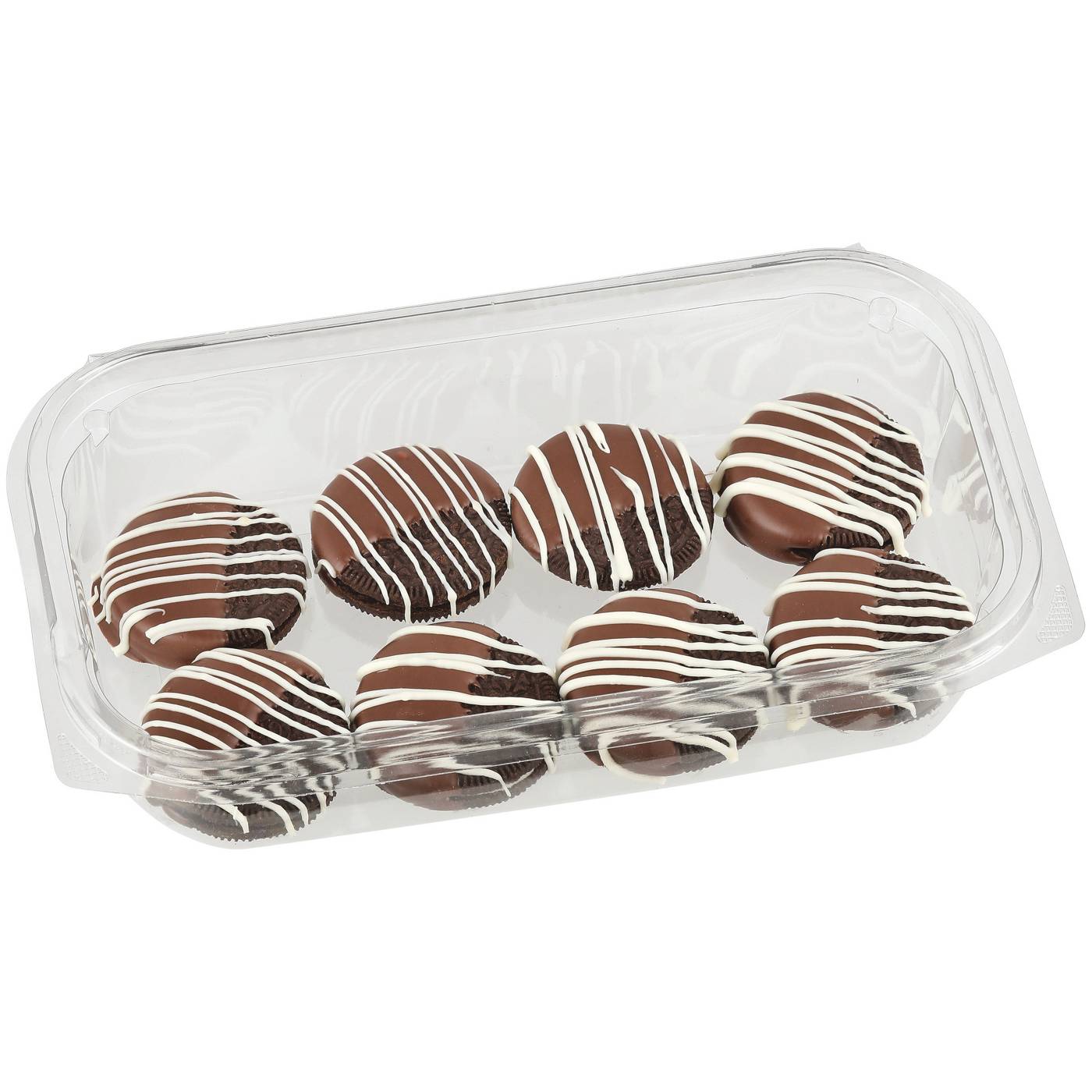 Indulge in one (or two!) of these delectable treats from our H-E-B Bakery. They're the perfect combo of crunchy creme-filled cookie and chocolatey goodness. Each OREO is hand-dipped in milk chocolate and decorated with squiggles of white chocolate.