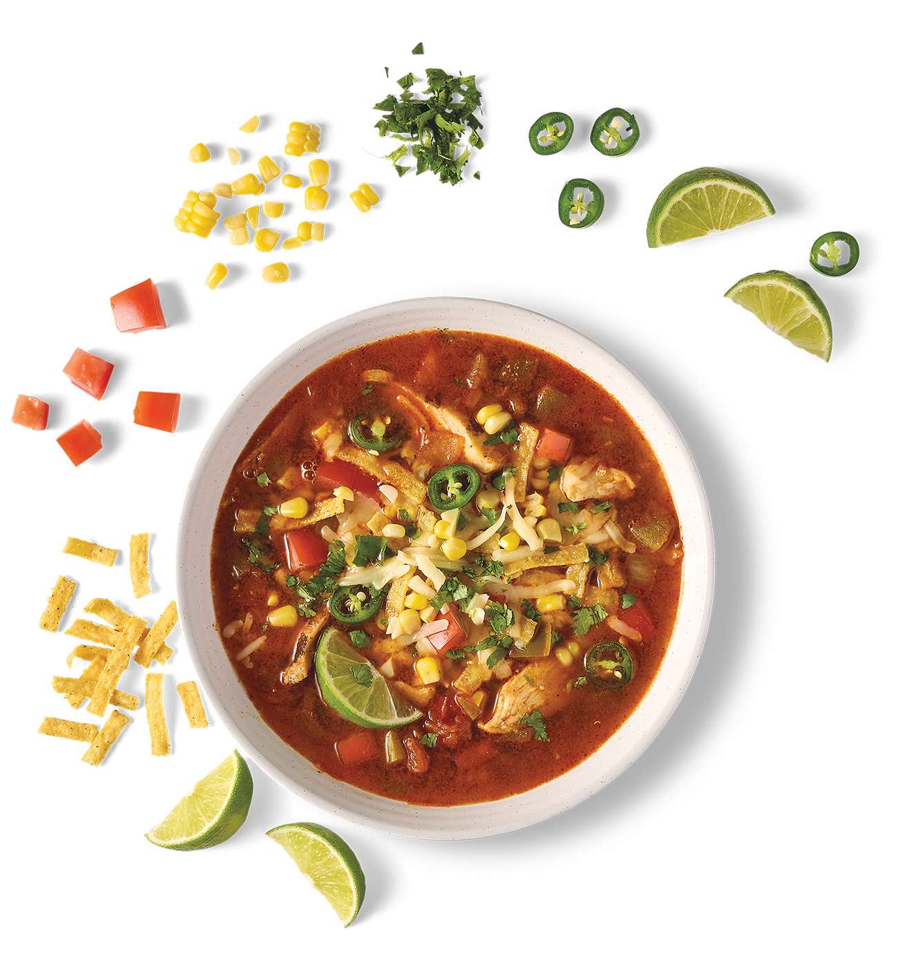 • Includes Chicken, veggies, seasoning, cheese, tortilla strips, serrano pepper, and cilantro