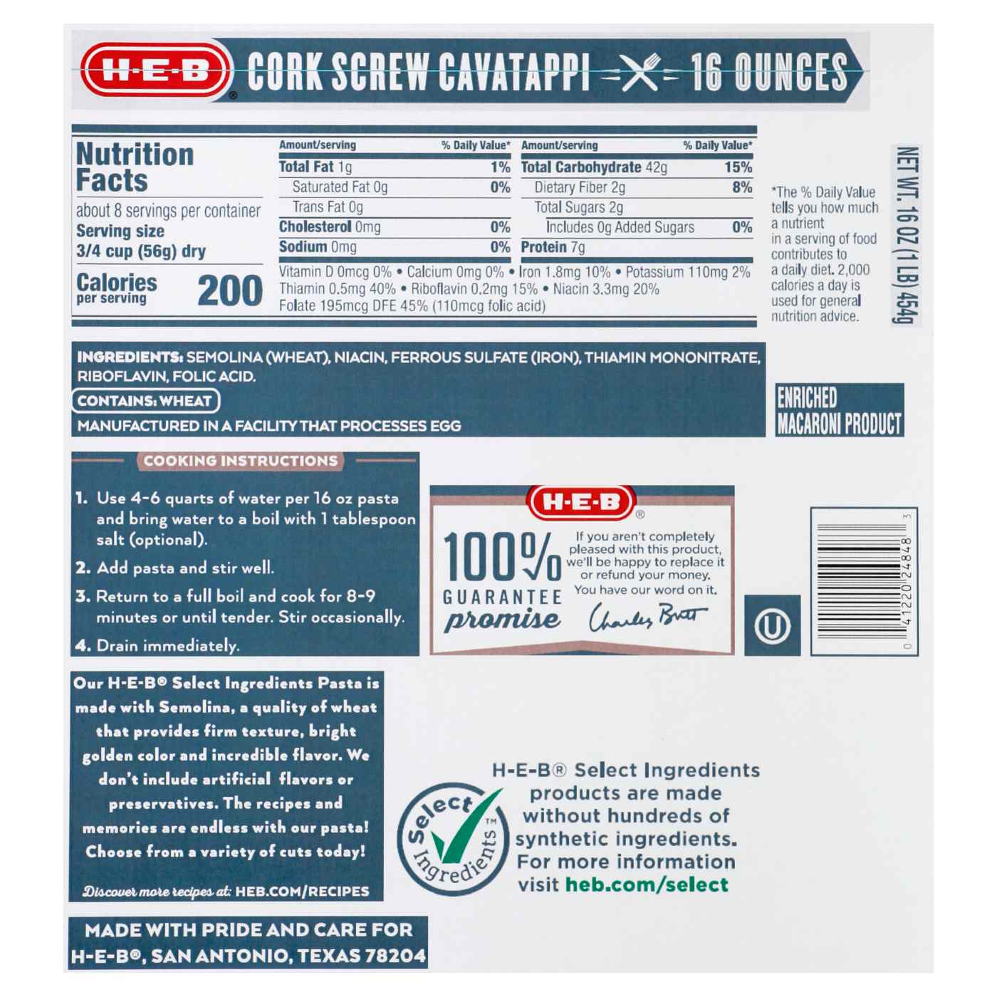 Enriched and made with semolina wheat, H-E-B cork screw cavatappi is a unique noodle to try in your favorite pasta dishes. Tubular and twisty, they make a hearty pasta salad and pair well with all kinds of sauces. To prepare cavatappi, boil them on the stovetop — they're ready in about 10 minutes.