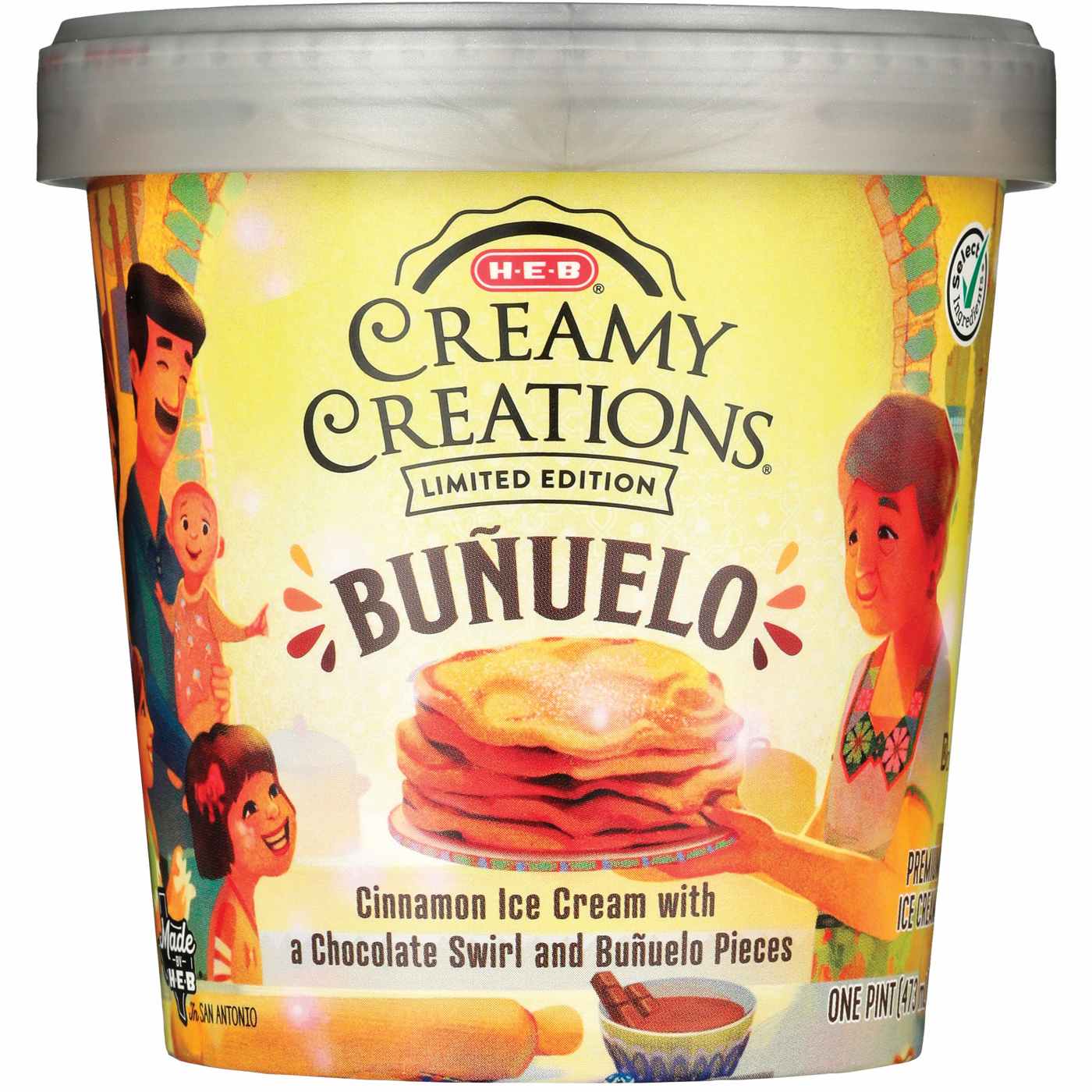 Inspired by the traditional Mexican dessert that's a favorite especially during the holidays, H-E-B Creamy Creations Bunuelo ice cream is cinnamon-based. Dig in and discover the pieces of fried dough covered in cinnamon sugar (bunuelos), as well as a thick chocolate swirl running throughout.