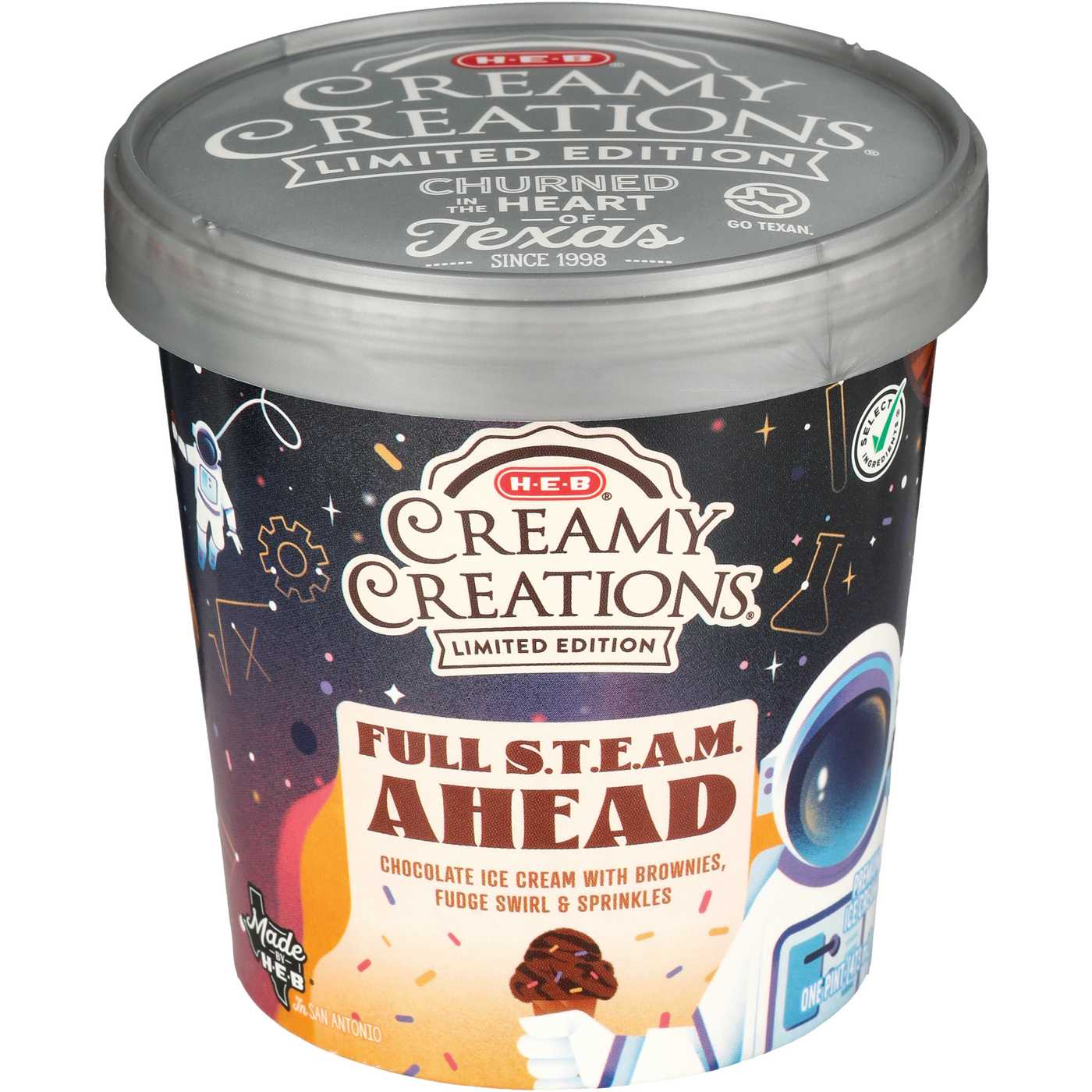 Shoot for the stars and enjoy some H-E-B Creamy Creations Full S.T.E.A.M. Ahead. This pint of chocolate ice cream is packed with hunks of brownies. Plus, there’s sprinkles and a fudge swirl running throughout this limited edition flavor.