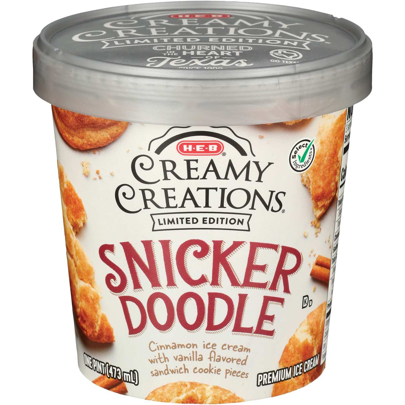 Indulge in this special limited edition of H-E-B Creamy Creations ice cream. It's cinnamon-based with pieces of naturally vanilla-flavored sandwich cookies throughout. Each rich and sweet spoonful of Snickerdoodle is sure to keep you coming back for another.