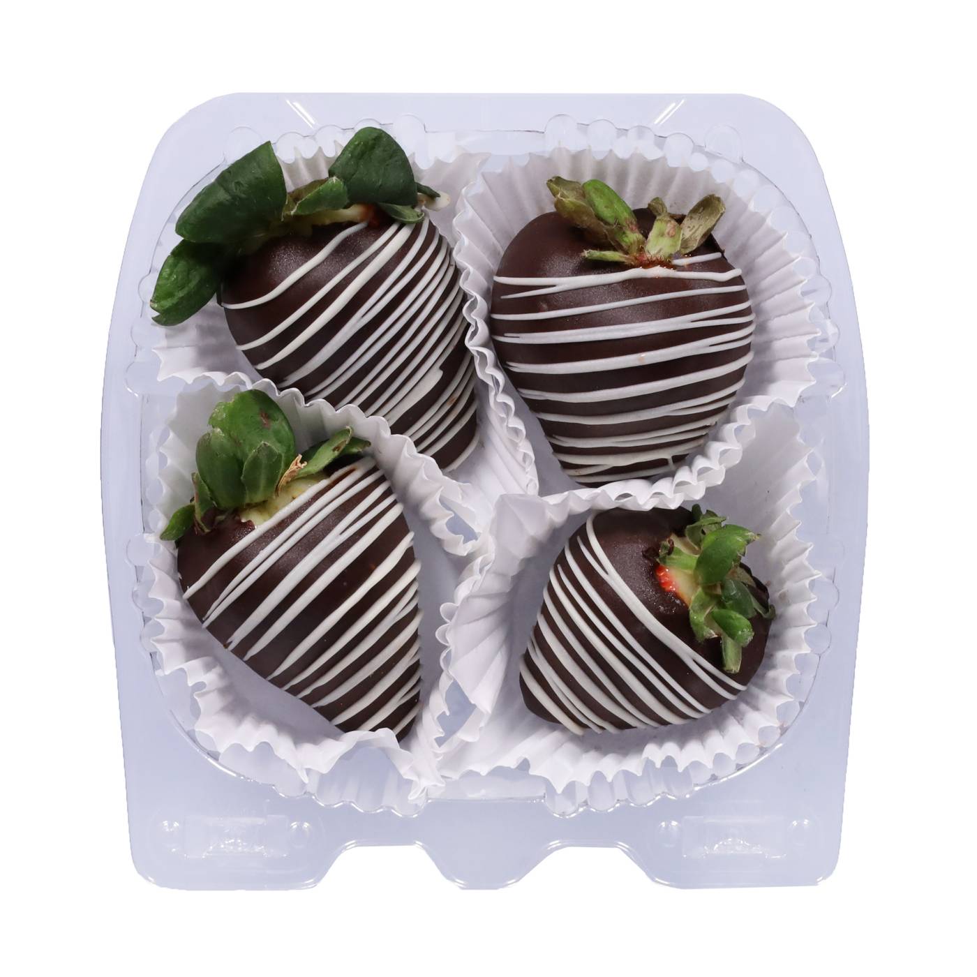 From our H-E-B Bakery, these dark chocolate-dipped strawberries are a decadent treat for sweet celebrations. Fresh strawberries are coated in dark chocolate and then drizzled with white chocolate. Plus, each berry is artfully arranged in a paper liner.