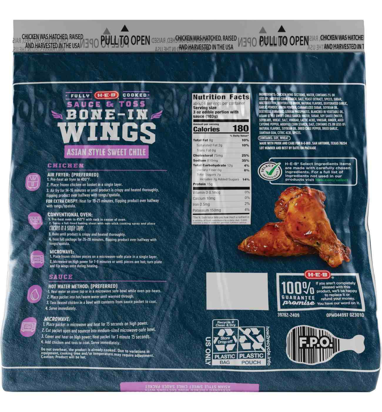 CHICKEN WING SECTIONS, WATER, CONTAINS 2% OR LESS OF: MODIFIED CORN STARCH, SALT, YEAST EXTRACT, SPICES, SUGAR, MALTODEXTRIN, DEHYDRATED ONION, NATURAL FLAVORS, DEHYDRATED GARLIC, GARLIC POWDER, ONION POWDER, CARAMELIZED SUGAR, SOYBEAN OIL, DEXTROSE, TURMERIC, SODIUM PHOSPHATES. BLANCHED IN VEGETABLE OIL. ASIAN STYLE SWEET CHILE SAUCE: WATER, SUGAR, SOY SAUCE (WATER, SOYBEANS, WHEAT, SALT, VINEGAR, LACTIC ACID), VINEGAR, GINGER, AGED CAYENNE PEPPER, MODIFIED CORN STARCH, SALT, CONTAINS 2% OR LESS OF: NATURAL FLAVORS, SOYBEAN OIL, DRIED CHILE PEPPER, DRIED GARLIC, XANTHAN GUM, CITRIC ACID, SPICES.Allergens and safety warnings