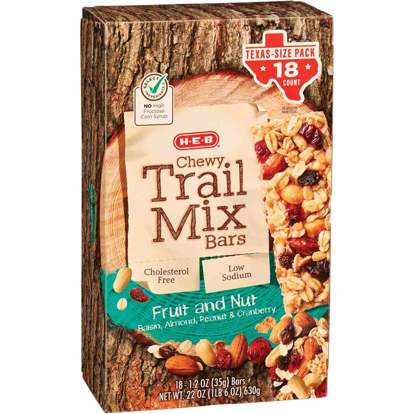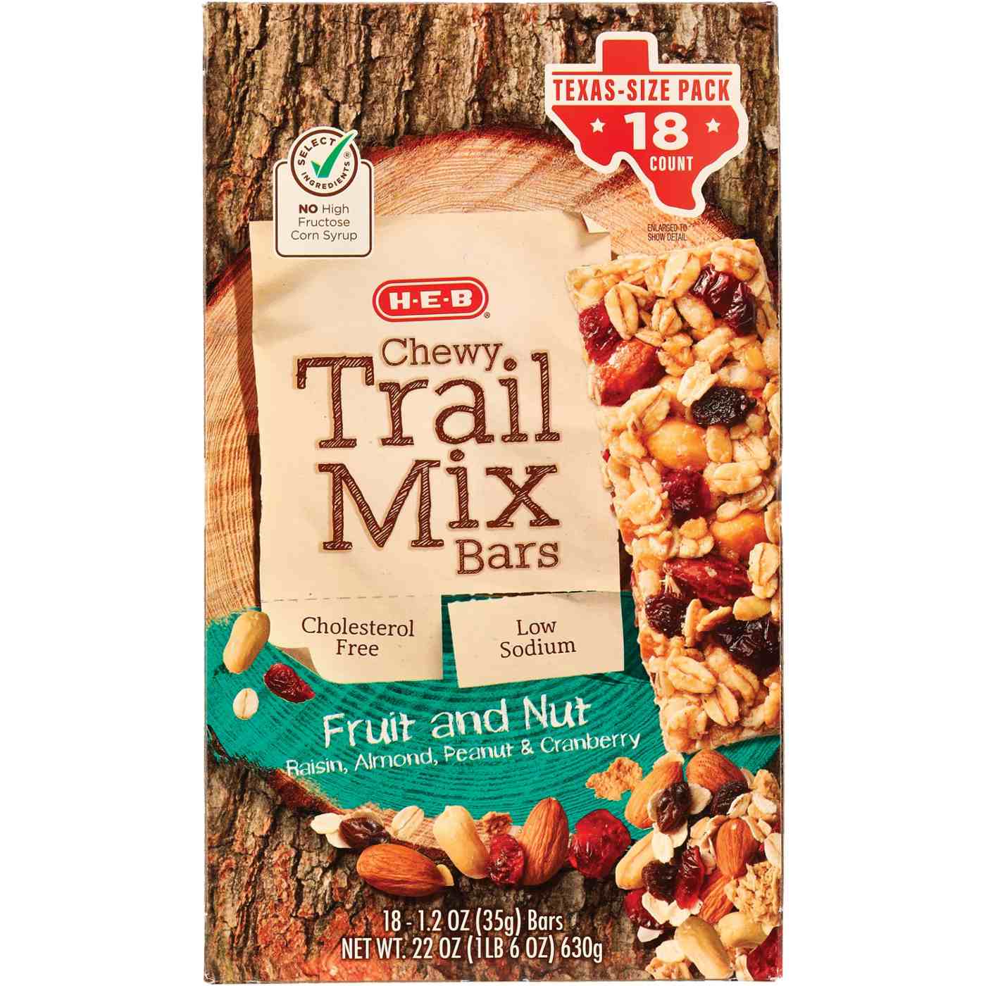 Jam-packed with fruit and nuts (raisins, cranberries, almonds and peanuts), these H-E-B Chewy Trail Mix Bars come in a convenient Texas-Size Pack that really stocks up your pantry. Individually wrapped and easy to take along, they give you an energy boost between meals and satisfy pesky hunger pangs.