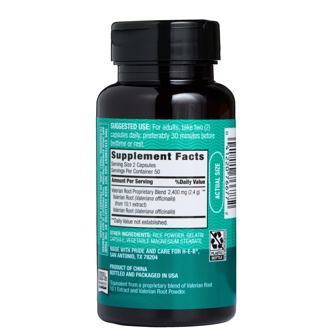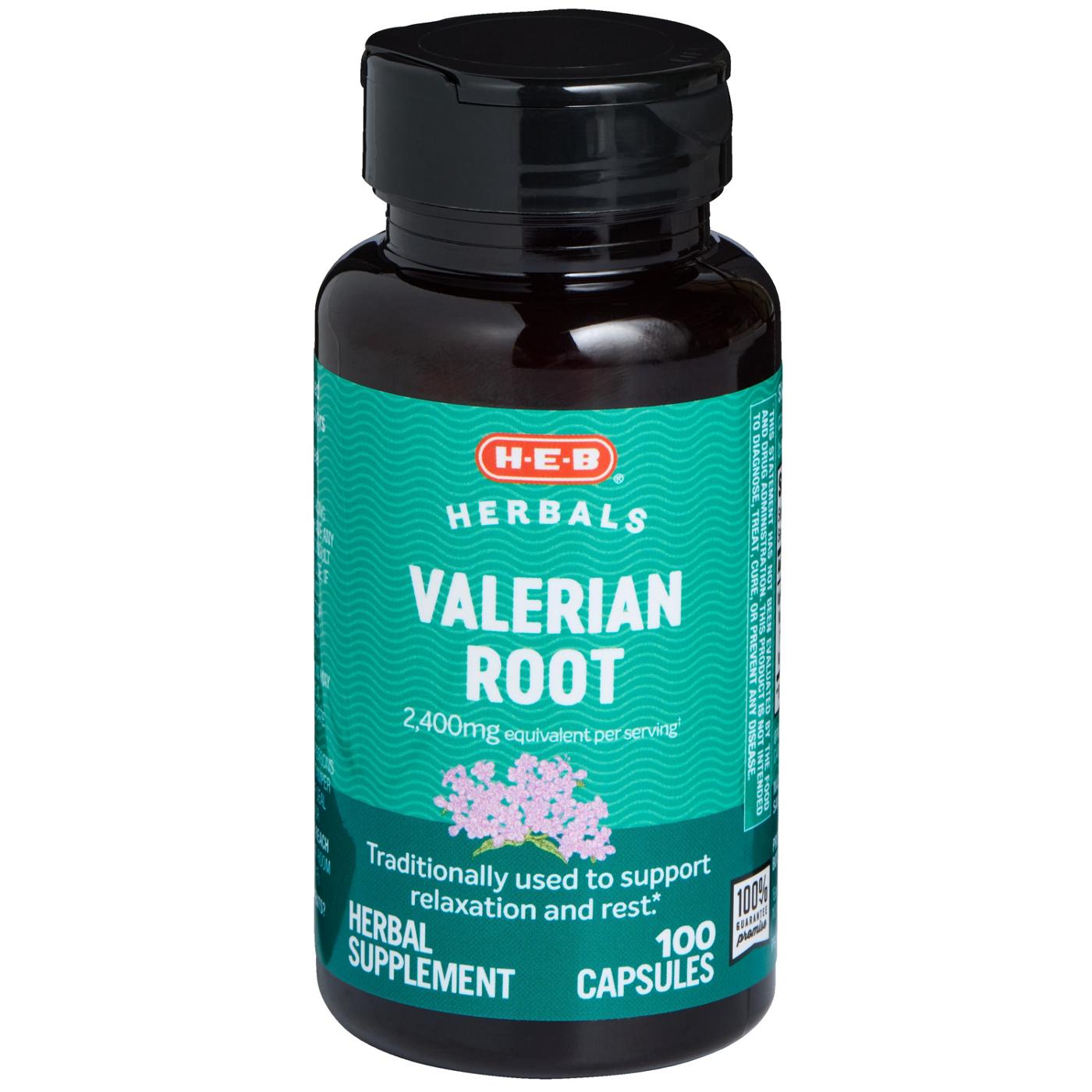 Take these H-E-B valerian root herbal supplement capsules and get 2,400 mg per serving. Add this supplement traditionally used to support relaxation and rest to your routine.
