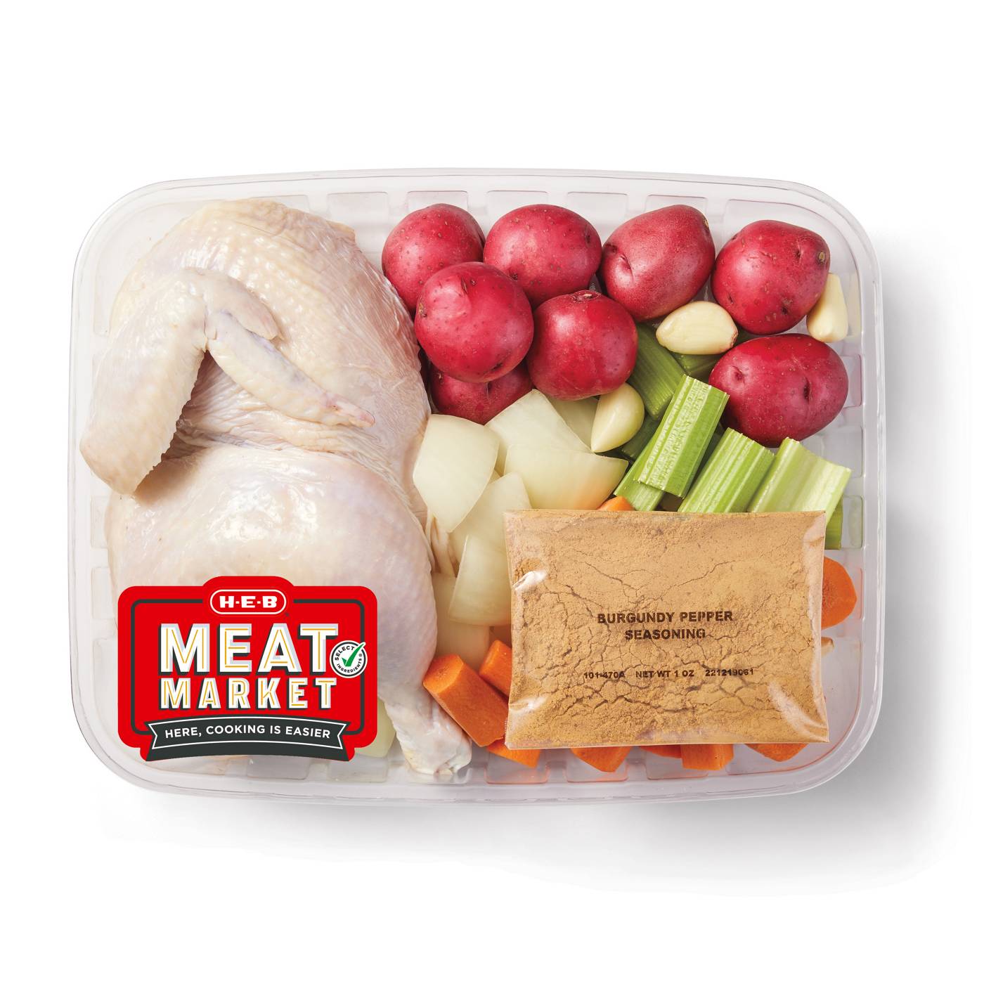 For a just-right-sized Sunday roast, pick up this kit from our H-E-B Meat Market. It includes a half chicken, plus prepped red potatoes, carrots, onion, celery and garlic cloves. Count on the Burgundy Pepper seasoning packet to give this hearty dinner even more scrumptious flavor.