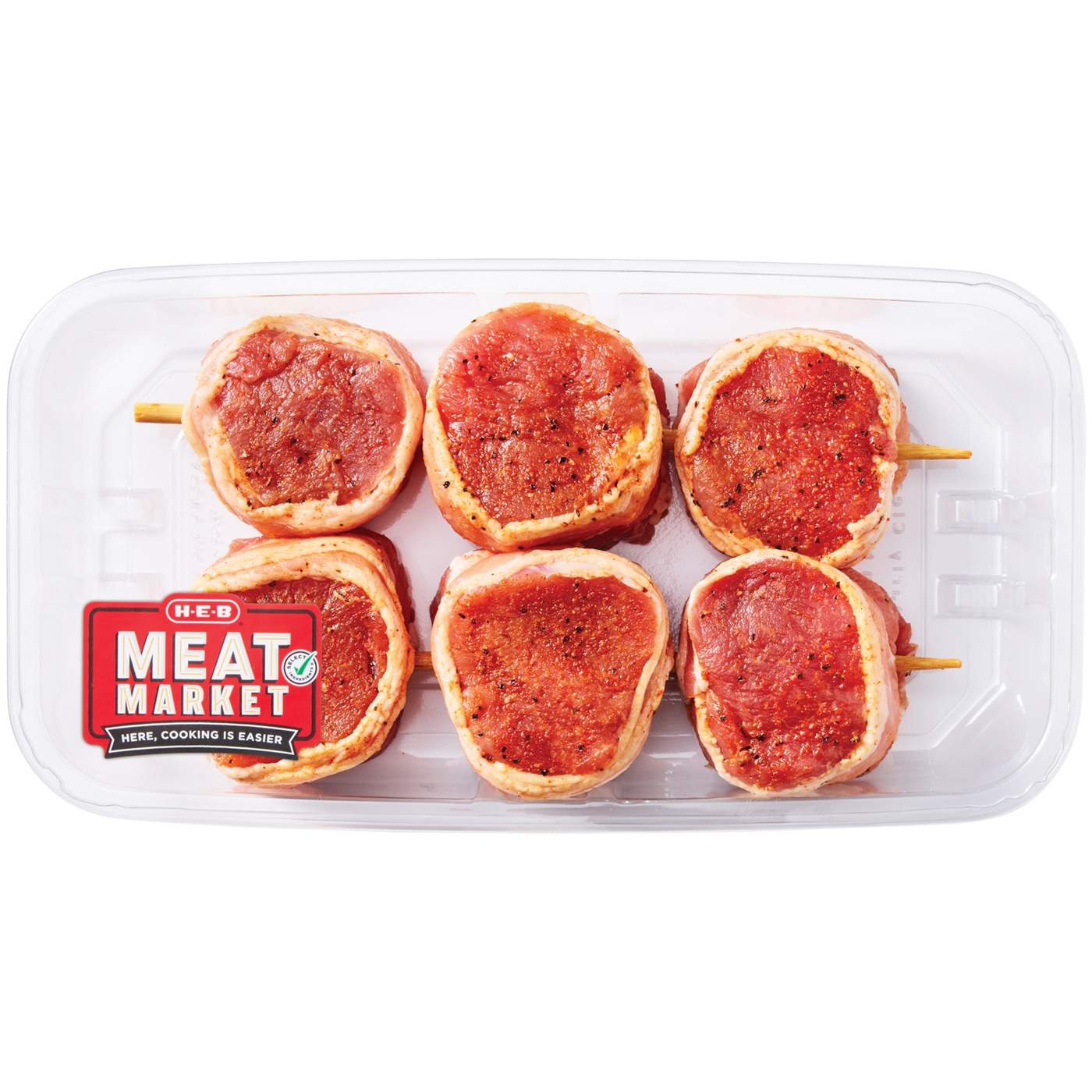 Conveniently already seasoned with a robust blend of spices, our H-E-B Meat Market pork tenderloin kabobs are a tasty dinner idea. Wrapped in bacon, they're good to grill or air fry and go great with your favorite sides. To select how many kabobs you'd like, click the Add to Cart button. They come wrapped in butcher paper.