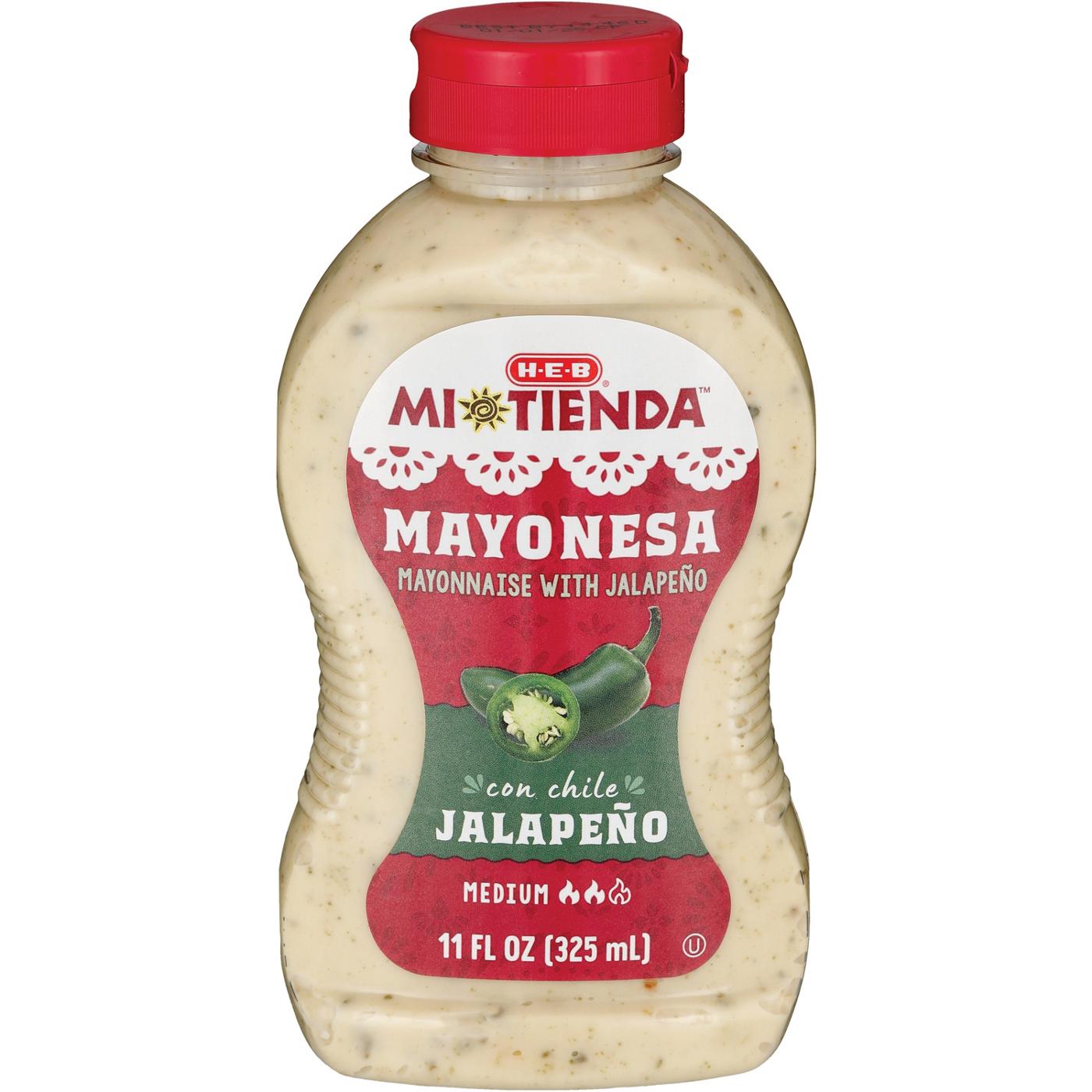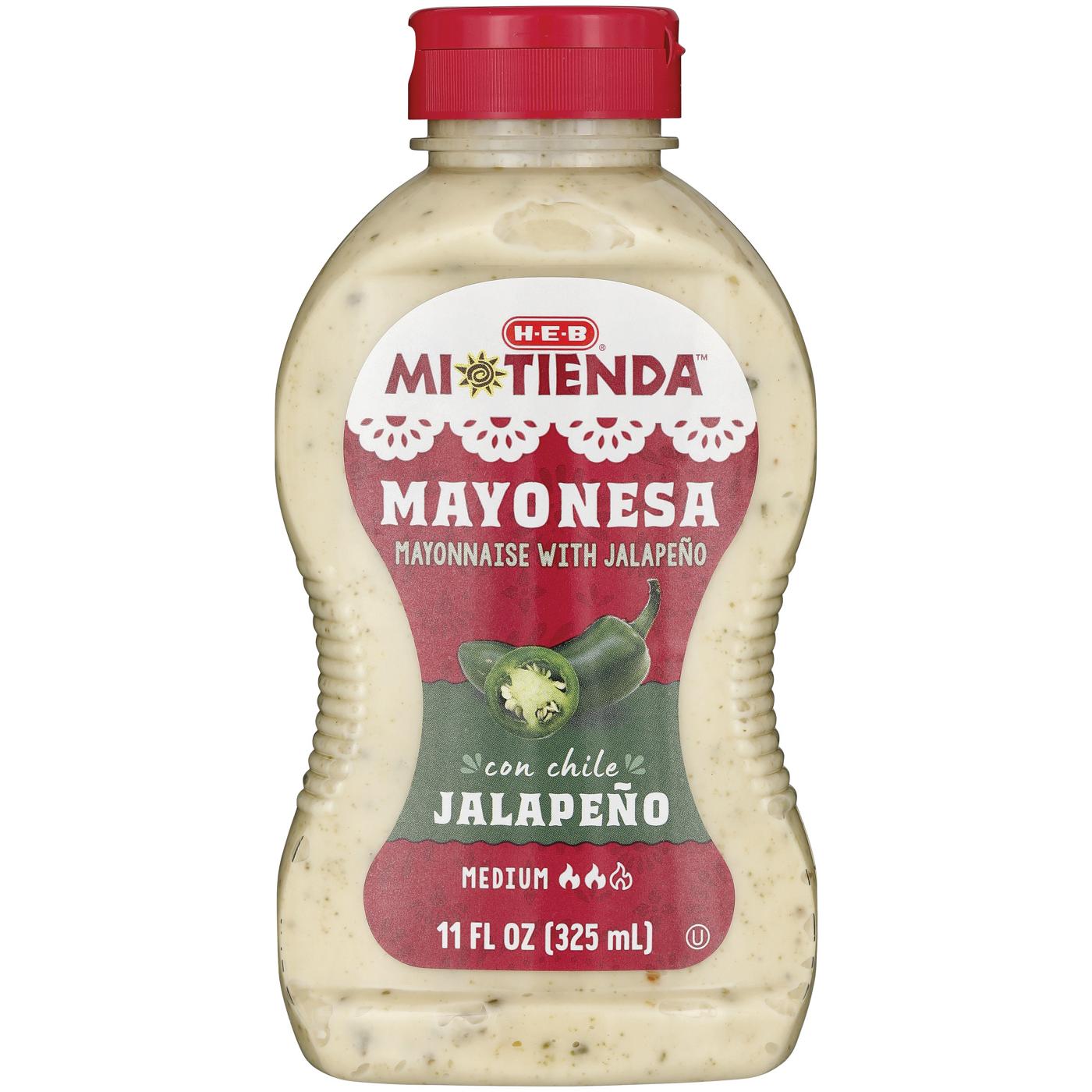 Add a medium-spicy kick to many of your favorites with H-E-B Mi Tienda mayonesa con chile jalapeño. Packaged in an easy squeeze bottle, this flavored mayo is perfect for tacos, elote, protein salads and tortas. Try using this creamy condiment as a substitute for regular mayonnaise in potato salad, macaroni salad and deviled eggs as well.