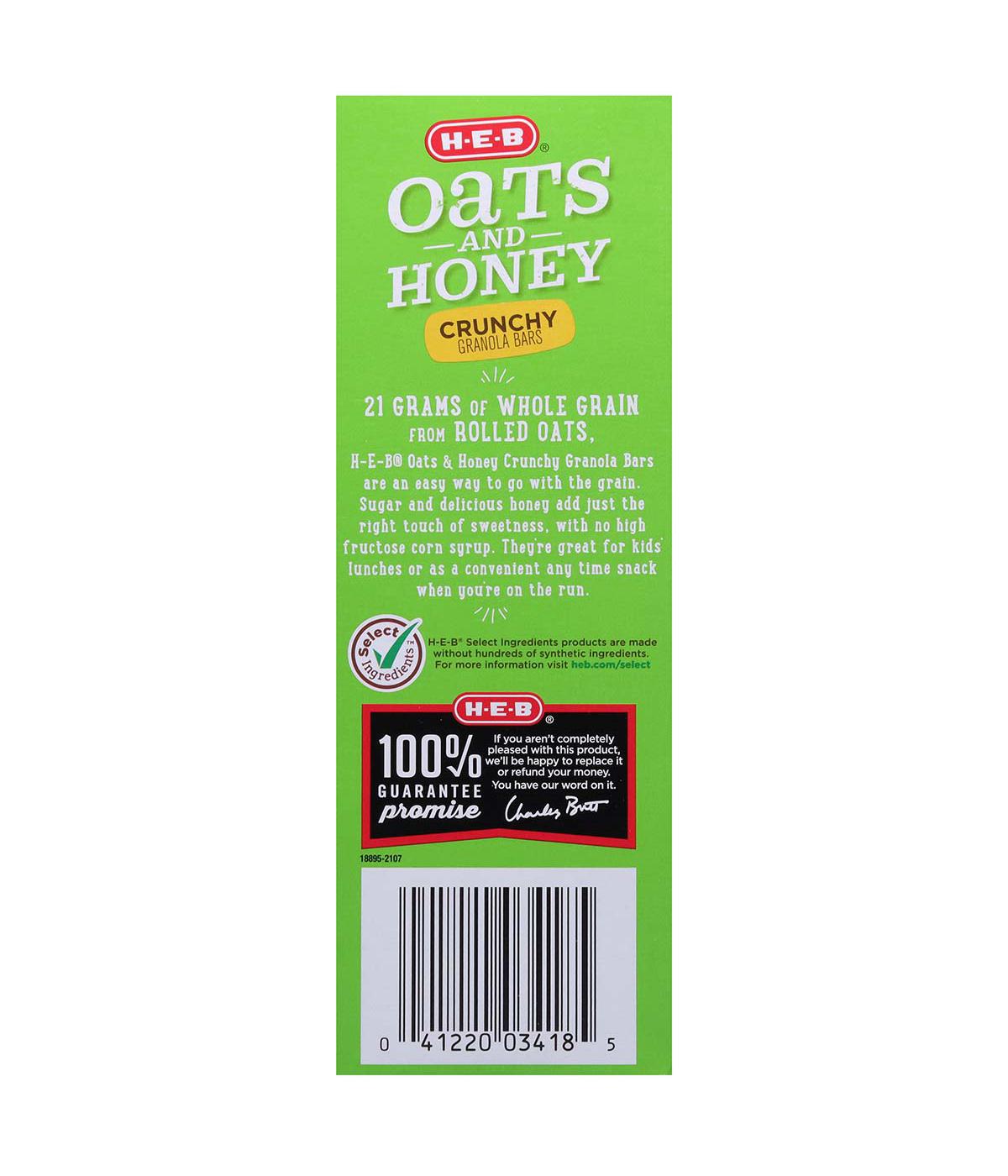 Wholesome-tasting with a touch of sweetness, H-E-B oats & honey granola bars are supremely crunchy and great for snacking. Plus, there's 21 grams of whole grain from rolled oats in every double-bar pack and no high fructose corn syrup.