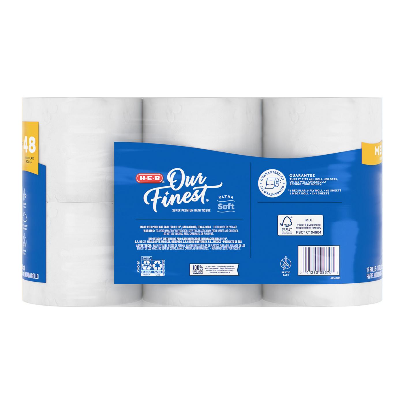 The comfort of your own bathroom starts with comfortable and dependable toilet paper. H-E-B Our Finest Ultra Soft delivers a soft, confident and reliable clean. This is our most premium toilet paper, with two layers of softness for extra comfort. These 12 Mega rolls equal 48 regular rolls – that’s 4X the sheets per roll! Our Finest Ultra Soft bath tissue is soft, absorbent and flushable. Made with strength in mind, it delivers a soft, comfortable and confident wipe you can depend on. Add a pack to your cart and give it a try.​​​