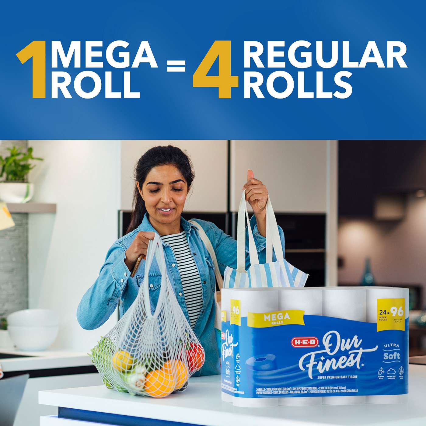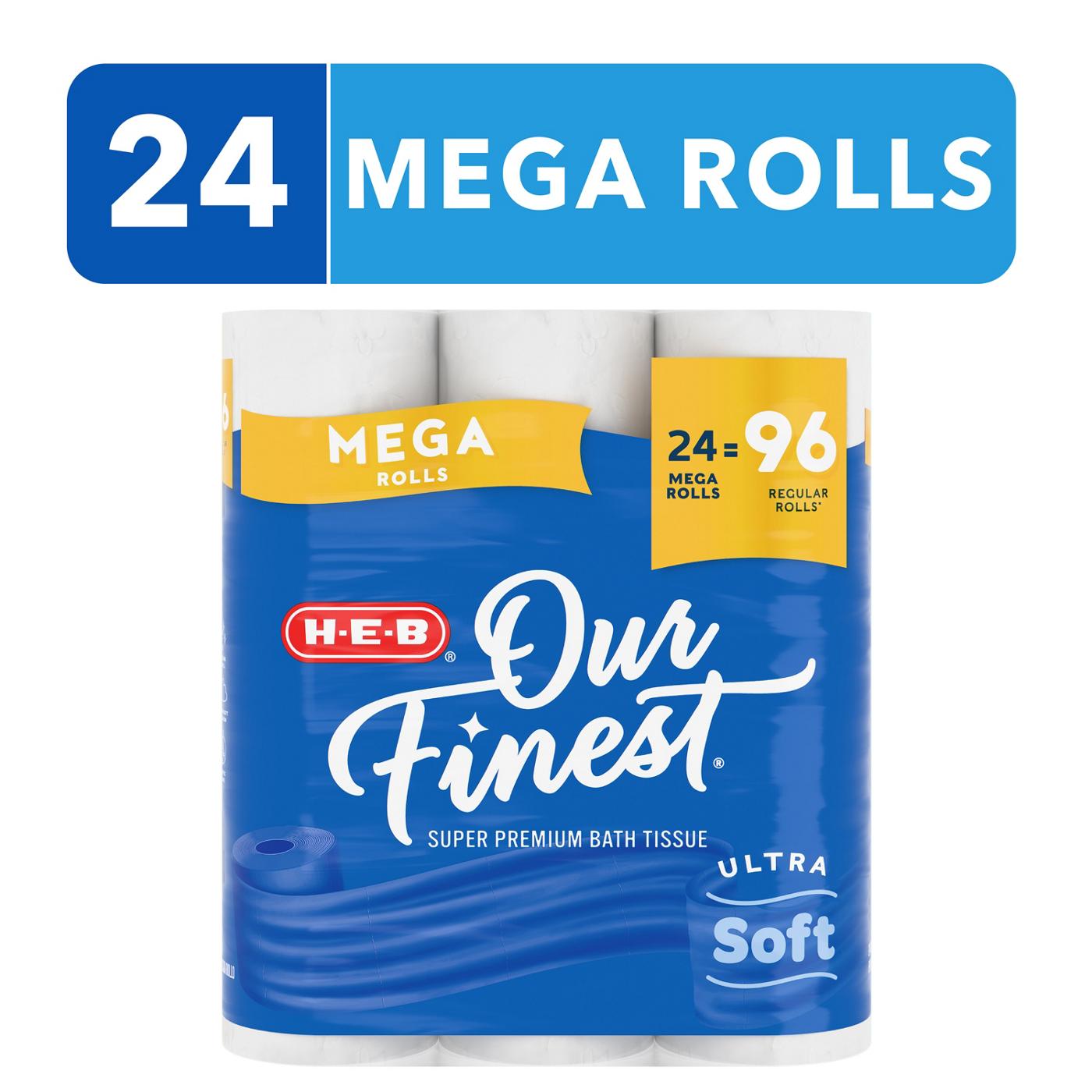 The comfort of your own bathroom starts with comfortable and reliable toilet paper. H-E-B Our Finest Ultra Soft delivers a cushiony and dependable clean every time. This is our most premium toilet paper, with two layers of softness for extra comfort. These 24 Mega rolls equal 96 regular rolls – that’s 4X the sheets per roll! Our Finest Ultra Soft bath tissue is absorbent and flushable. Made with strength in mind, it delivers a soft, absorbent and confident wipe you can depend on. Add a pack to your cart and give it a try!​​​​​