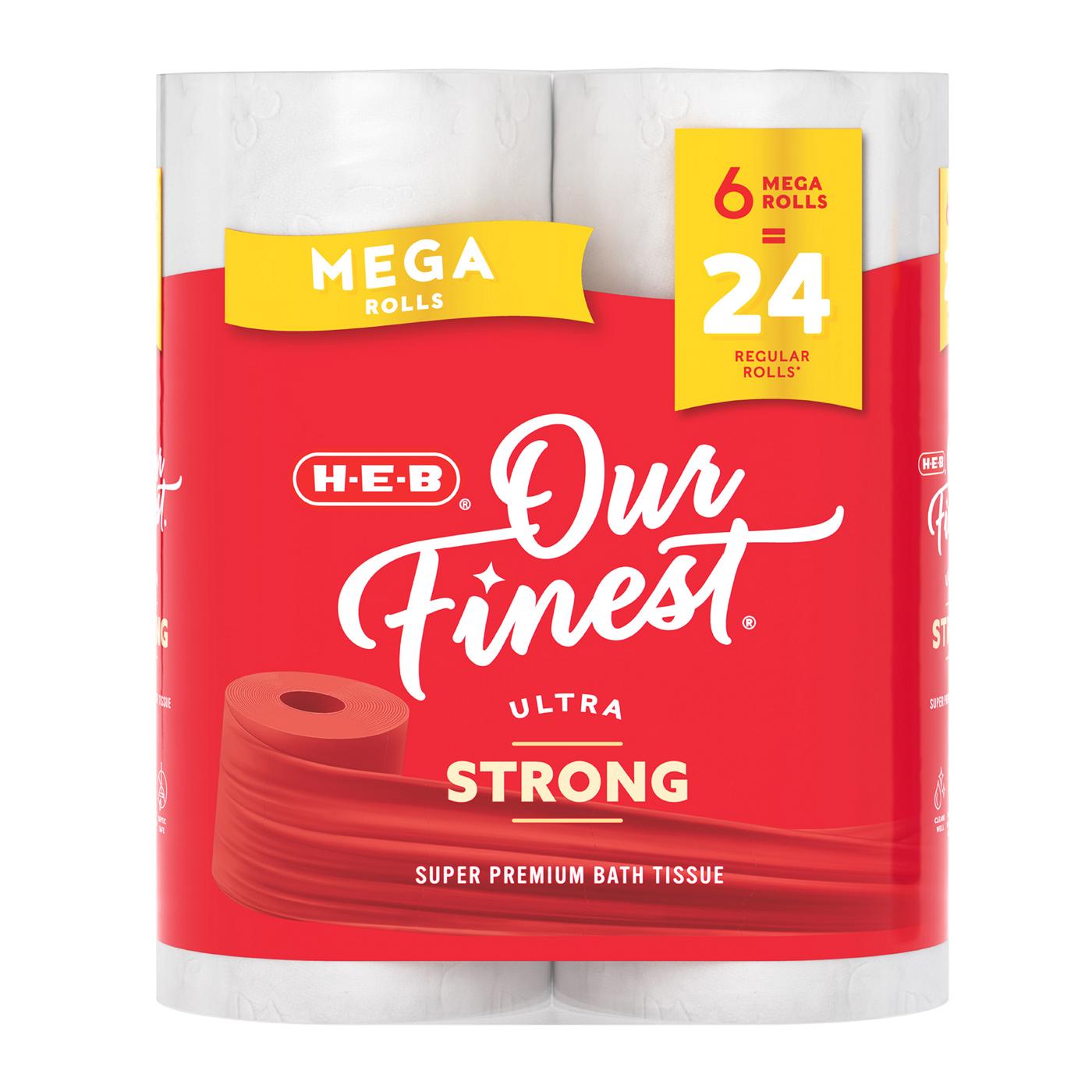 Made with strength in mind, H-E-B Our Finest Ultra Strong Mega Roll Toilet Paper delivers a strong, confident clean in every situation. This is our strongest 2-ply toilet paper yet, with the softness expected from us. This 6-roll of ultra strong mega toilet paper rolls is equal to 24 regular toilet paper rolls – that’s 4X the sheets per roll! Our Finest Ultra Strong bath tissue is absorbent, flushable and approved by the Forest Stewadship Council®. Add to your cart and sit on the throne with confidence!