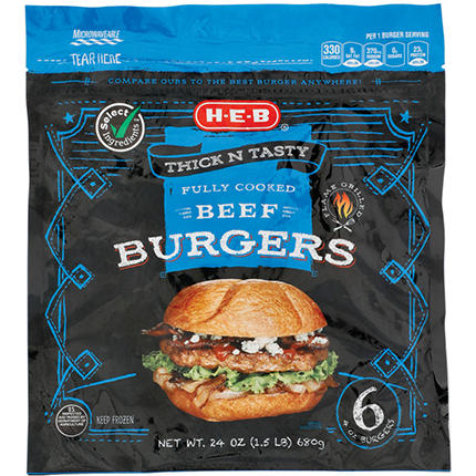 Flame-grilled for that juicy, beefy taste you know and love, these H-E-B burger patties are fully cooked. Easy to heat up from frozen in the microwave or in a skillet, they're a convenient option for lunch or dinner when everyone's craving hamburgers. Prep your favorite fixings, like cheese, lettuce and tomato, while they sizzle to perfection.