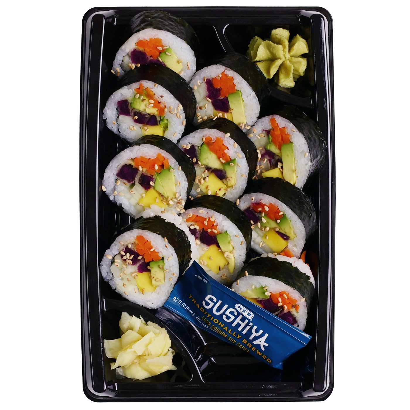 Sushi Rice (White Rice, Water, Sushi Vinegar [Invert Sugar, Water, Distilled Vinegar, Salt, Corn Syrup, Rice Vinegar, Fermented Rice Extract {Rice, Alcohol, Salt, Citric Acid}, Brown Sugar]), Sweet Potato Tempura (Sweet Potato, Tempura Batter [Wheat Flour, Potato Starch, Corn Flour, Baking Powder {Sodium Bicarbonate, Sodium Acid Pyrophosphate, Monocalcium Phosphate, Tapioca Starch}, Salt], Tapioca Starch, Rice Flour, Soybean Oil), Avocado, Mango, Carrot, Cucumber, Wasabi (Horseradish, Corn Flour, Turmeric, Spirulina Powder, Water), Sushi Ginger (Ginger, Water, Salt, Sugar, Vinegar), Seaweed, Sesame Seed.Allergens and safety warnings