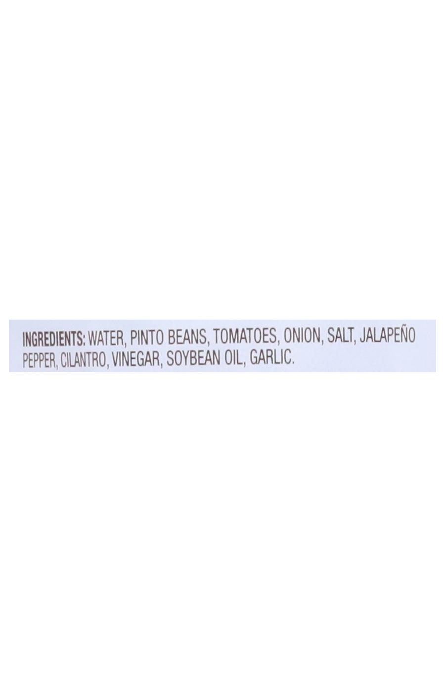 Water, Pinto Beans, Tomatoes, Onion, Salt, Jalapeño Pepper, Cilantro, Vinegar, Soybean Oil, Garlic.