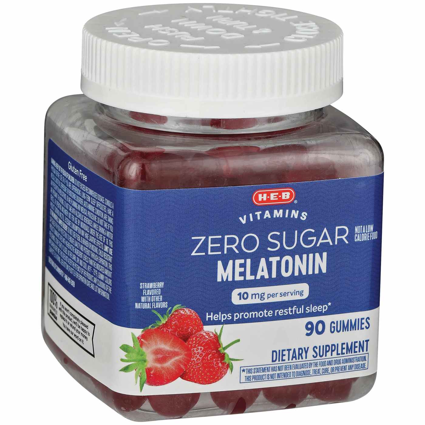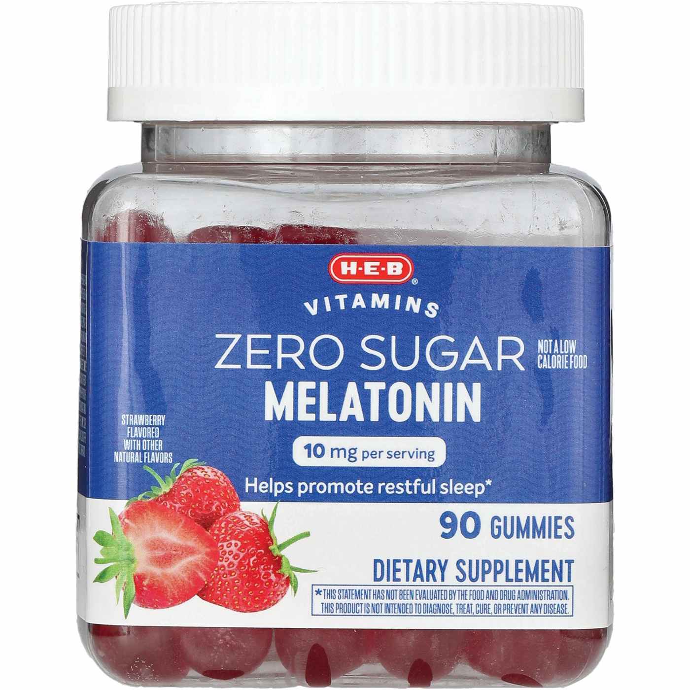 H-E-B Vitamins Zero Sugar Melatonin 10 mg Gummies - Strawberry are your perfect companion for a restful night's sleep. Each gummy contains 10 mg of melatonin, a natural hormone that helps regulate your sleep-wake cycle. These delicious strawberry-flavored gummies are sugar-free, making them a healthy and enjoyable way to support your sleep routine.