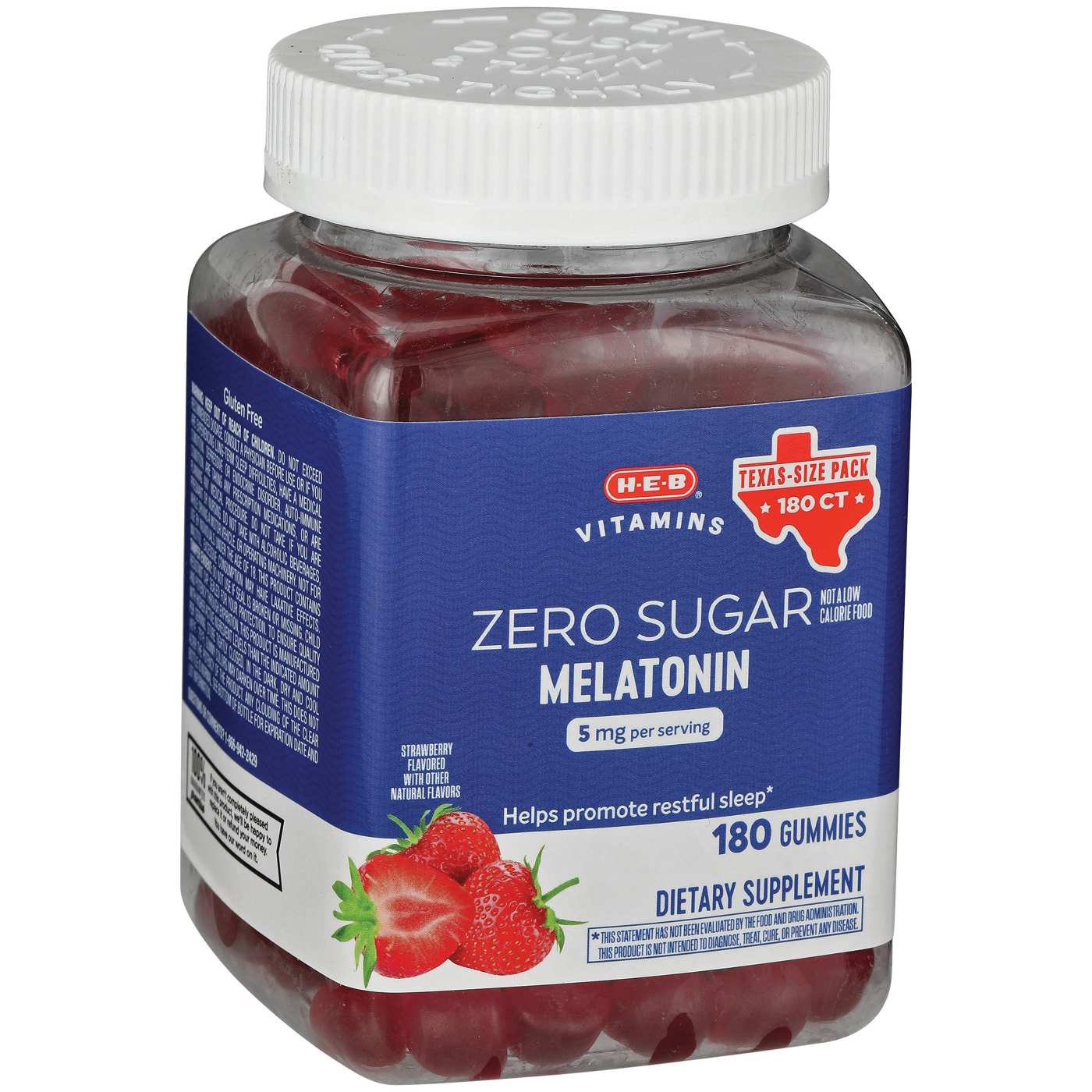 H-E-B Vitamins Zero Sugar Melatonin 5 mg Gummies - Strawberry are your perfect companion for a restful night's sleep. Each gummy contains 10 mg of melatonin, a natural hormone that helps regulate your sleep-wake cycle. These delicious strawberry-flavored gummies are sugar-free, making them a healthy and enjoyable way to support your sleep routine.