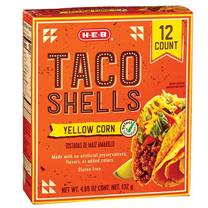 Crunchy and delicious, H-E-B yellow corn taco shells offer a fun way to mix up the menu. Heat these hard shells in the oven with their edges slightly overlapping before filling with seasoned ground beef, lettuce, salsa and cheese.