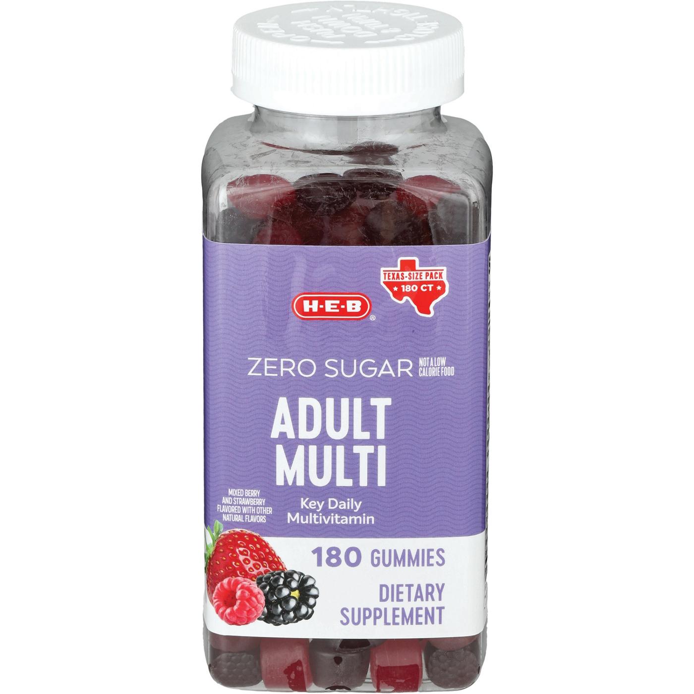 Stay healthy and energized with H-E-B Zero Sugar Adult Multivitamin Gummies. These delicious gummies are formulated to provide essential vitamins and minerals without any added sugar, making them a great choice for those looking to maintain a balanced diet.• Essential Nutrients: Packed with a blend of vitamins and minerals to support overall health and wellness• Zero Sugar: Enjoy the benefits of a multivitamin without any added sugar• Delicious Flavor: Tasty gummies that make taking your daily vitamins enjoyable• Convenient and Easy: Perfect for adults who prefer a gummy supplement over traditional pillsSupport your daily health with H-E-B Zero Sugar Adult Multivitamin Gummies. Enjoy a convenient, tasty, and sugar-free way to get the essential nutrients your body needs.