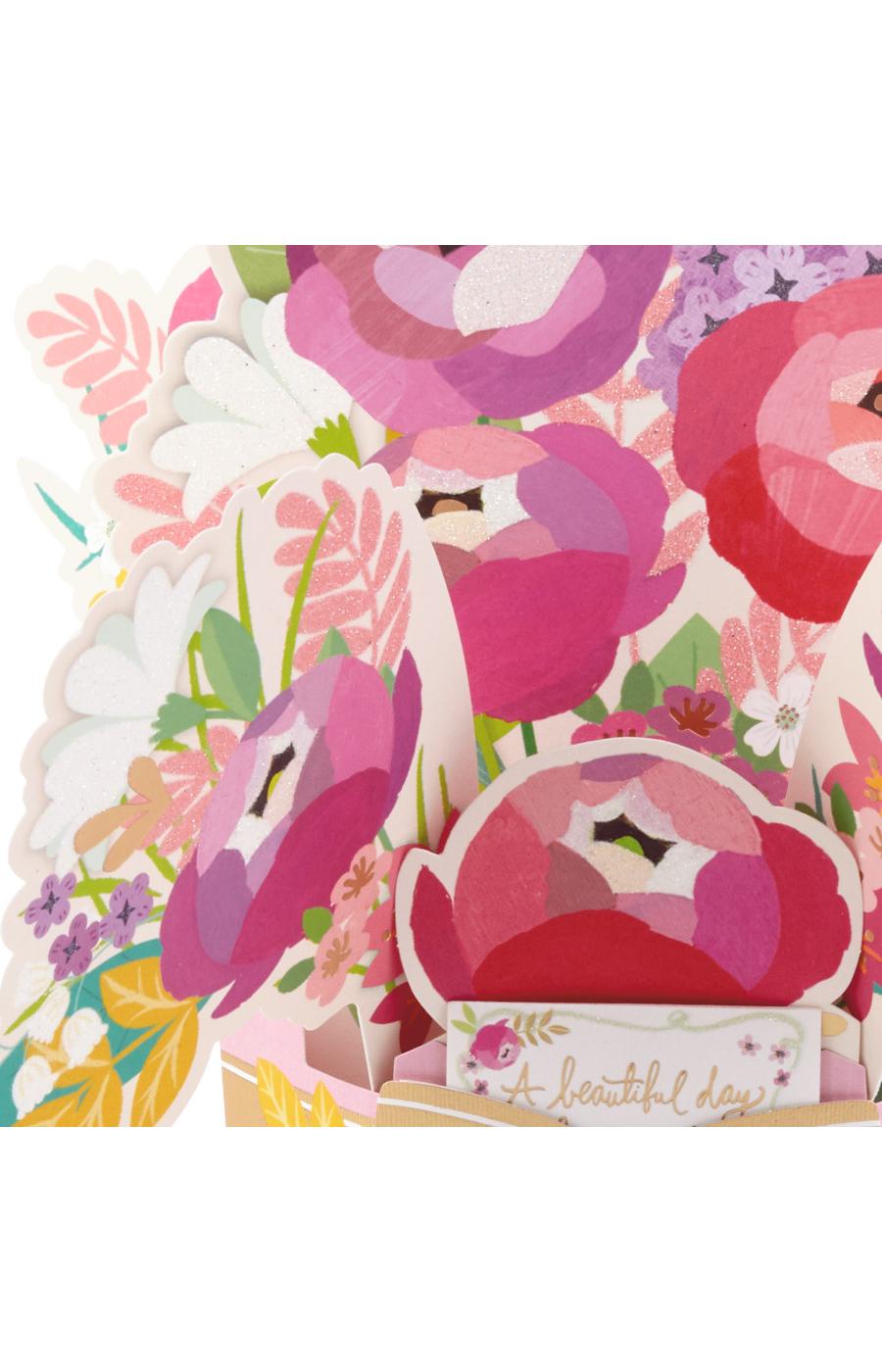 - Card folds flat and can be popped up into a three dimensional diorama of a bouquet of colorful flowers, accented with metallic foil. Card reads: "A beautiful day for beautiful you."