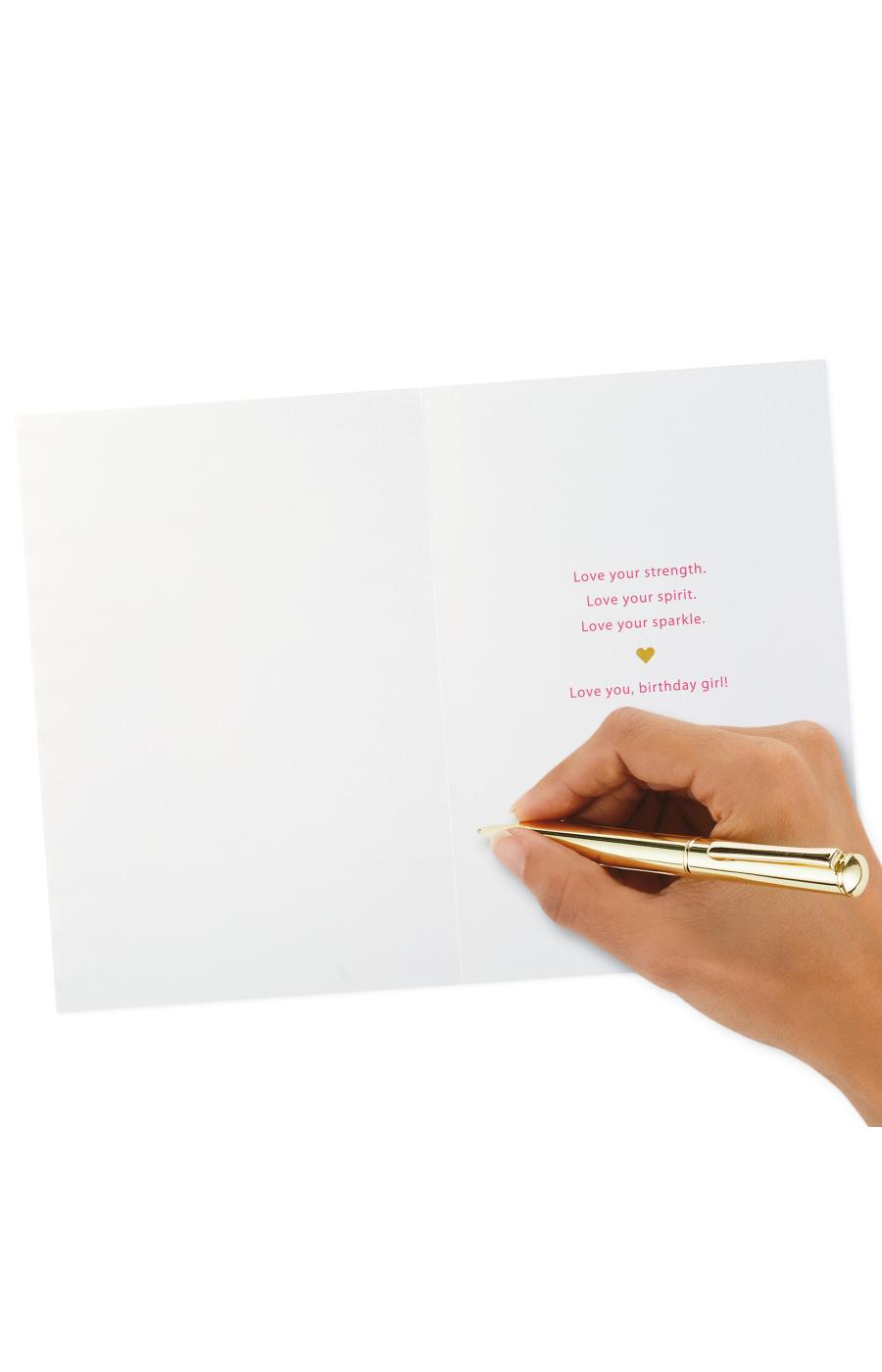 - Cover features hot pink ribbon stripes and a sparkly gold heart attachment. Inside reads: "Love your strength. Love your spirit. Love your sparkle. Love you, birthday girl!"