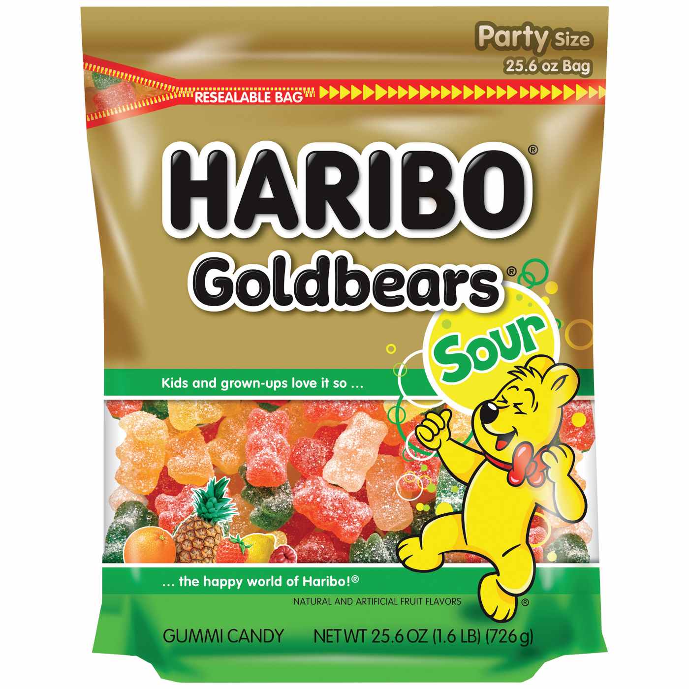 America’s #1 gummi bear has an exciting new jolt of flavor! Every bag of Sour Goldbears includes the classic Lemon, Orange, Pineapple, Raspberry, and Strawberry flavors with a sour and tangy twist!