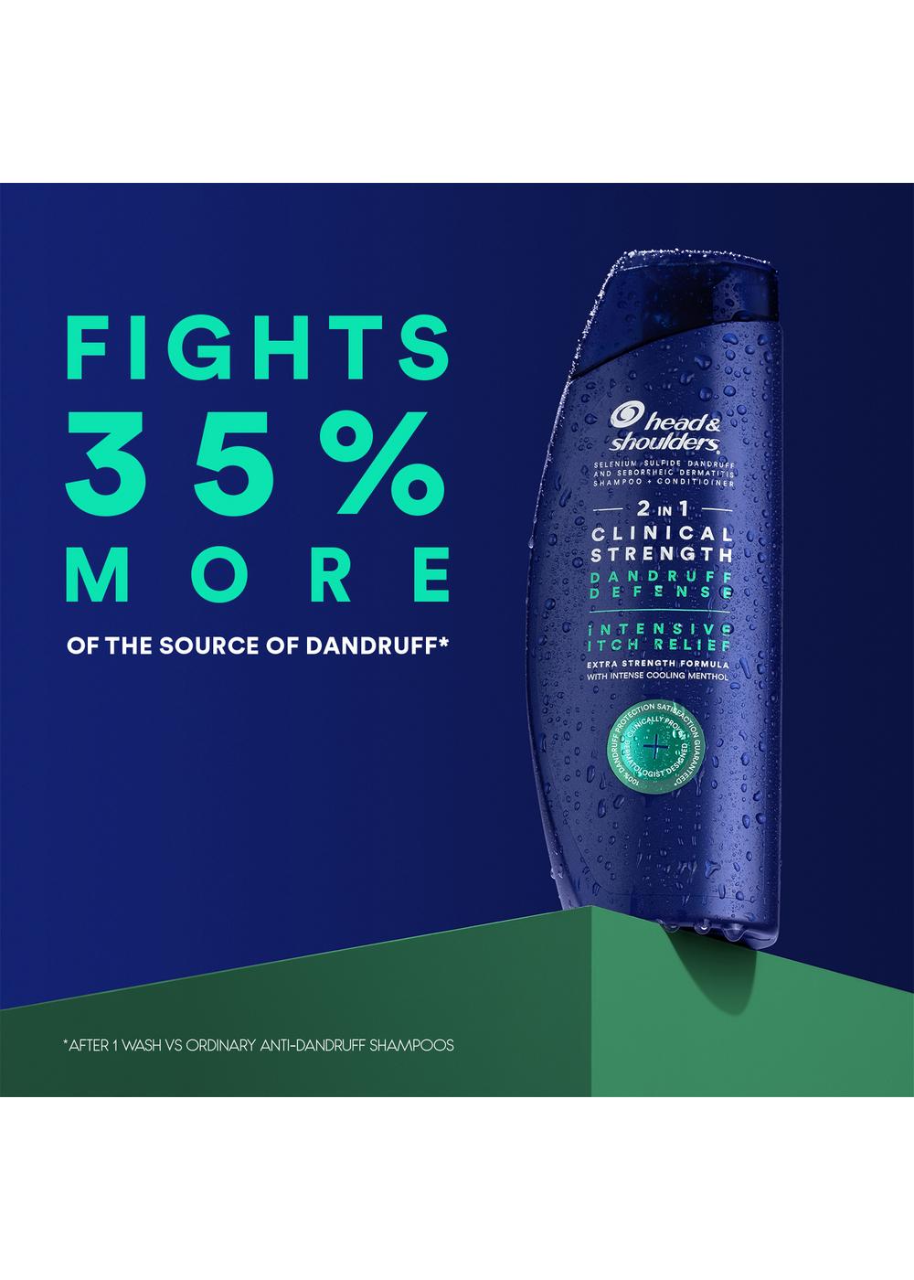 Introducing NEW Head & Shoulders Clinical Strength Dandruff Defense Intensive Itch Relief 2 in 1 Shampoo + Conditioner. Our formula provides prescription strength flake protection (vs prescription dandruff shampoo 2% ketoconazole) and provides soothing relief from itch associated with dandruff. Clinically proven to protect against flakes and dandruff, our shampoo is a great remedy for an itchy scalp. Clinical Strength Dandruff Defense + Intensive Itch Relief shampoo is infused with intense cooling menthol. Soothe your scalp and hair for a healthy, vibrant look you'll love.