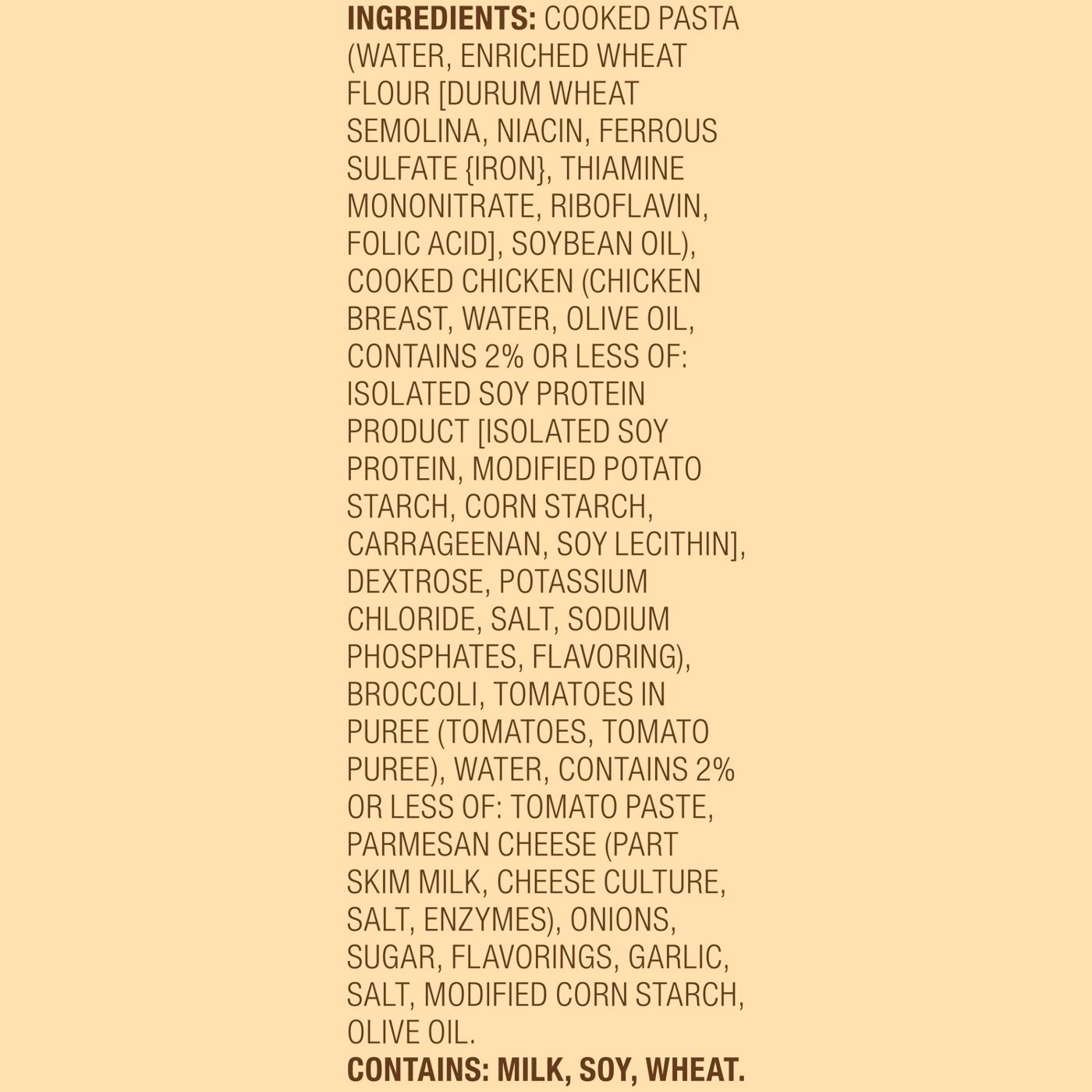 Cooked Pasta (Water, Enriched Wheat Flour [Durum Wheat Semolina, Niacin, Ferrous Sulfate (Iron), Thiamine Mononitrate, Riboflavin, Folic Acid], Soybean Oil), Cooked Chicken (Chicken Breast, Water, Olive Oil, Contains 2% or Less of: Isolated Soy Protein Product [Isolated Soy Protein, Modified Potato Starch, Corn Starch, Carrageenan, Soy Lecithin], Dextrose, Potassium Chloride, Salt, Sodium Phosphates, Flavoring), Broccoli, Tomatoes in Puree (Tomatoes, Tomato Puree), Water, Contains 2% or Less of: Tomato Paste, Parmesan Cheese (Part Skim Milk, Cheese Culture, Salt, Enzymes), Onions, Sugar, Flavorings, Garlic, Salt, Modified Corn Starch, Olive Oil.Allergens and safety warnings