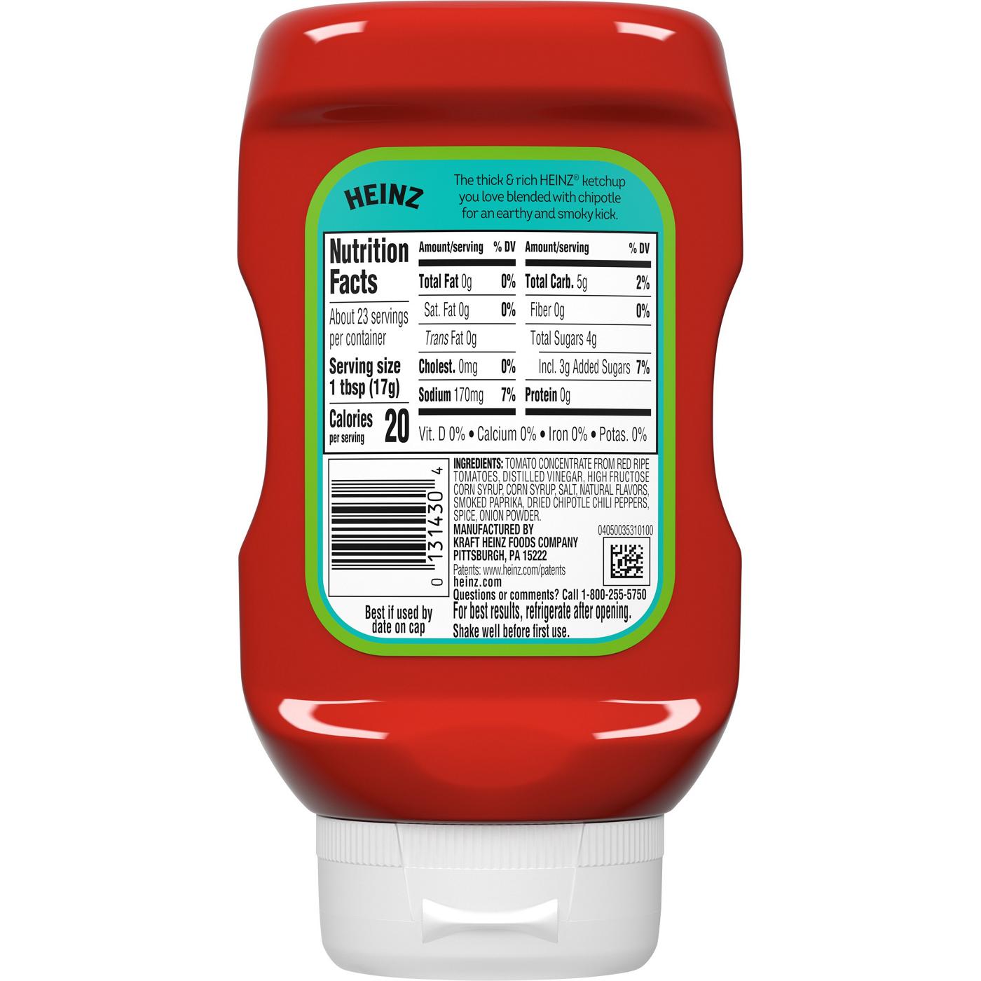 Ketchup lovers won't be able to keep cool when they hear the news — Heinz got hot! Add some spice to any meal with Heinz Tomato Ketchup Blended With Chipotle. We blended our thick and rich ketchup with chipotle to create a flavorful twist on a classic sauce. Chipotle ketchup has a medium spice level, perfect for adding a smoky taste. Our spicy ketchup is a bold upgrade to boring burgers and hot dogs. You can even use it as a dip for chicken nuggets and fries. Spicy ketchup isn't just for lunch and dinner. It's sure to wake you up too! Drizzle Heinz Tomato Ketchup Blended With Chipotle over scrambled eggs or add on your favorite breakfast sandwich. Heinz comes in a 14 oz squeezable bottle. Serving our spicy ketchup is simple and mess-free with our easy-to-squeeze bottle. Keep our kickin' ketchup in the refrigerator after opening to preserve the earthy flavor. Squeeze, drizzle and devour any meal topped with Heinz Tomato Ketchup Blended With Chipotle.