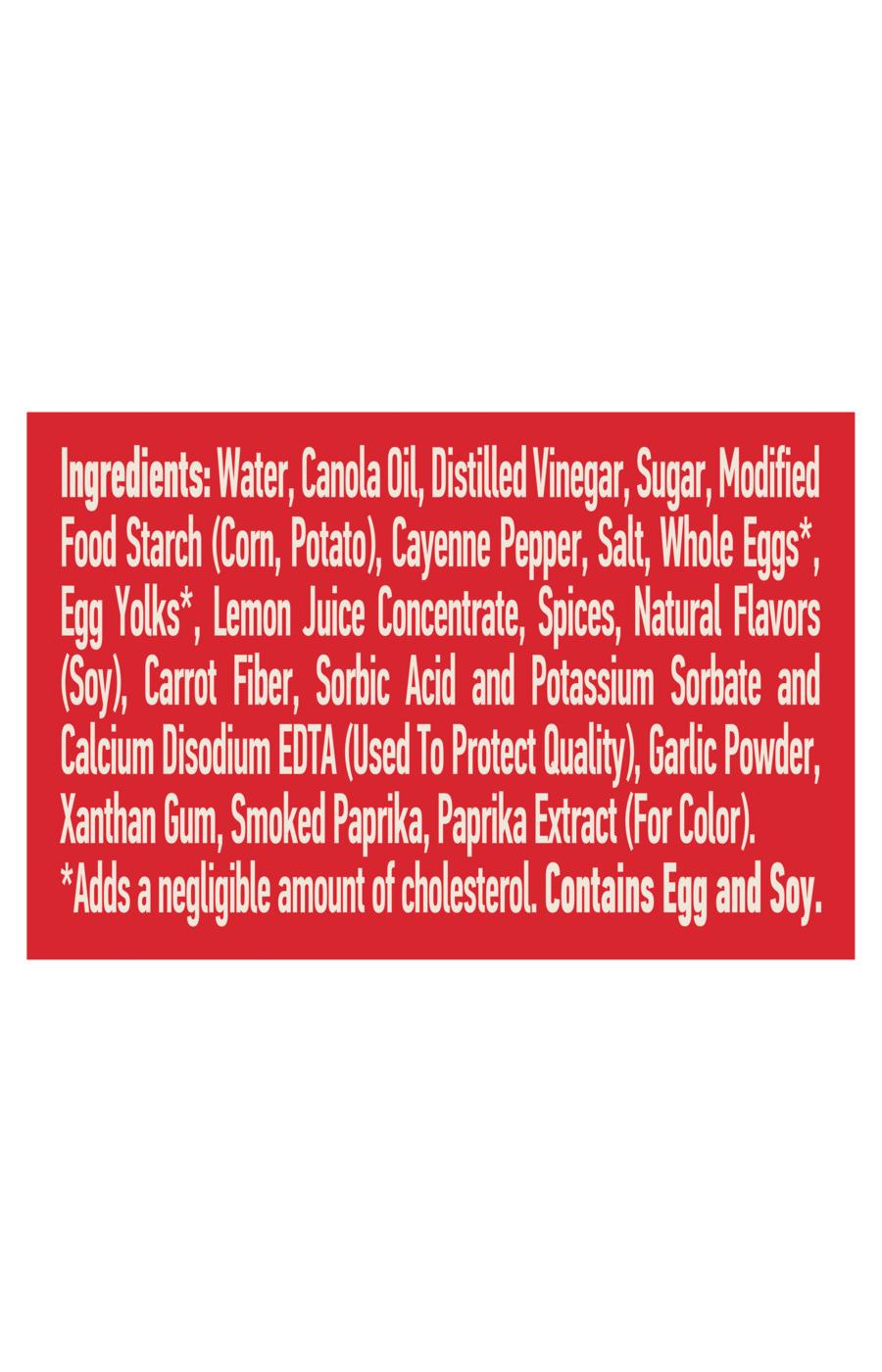 Water, Canola Oil, Distilled Vinegar, Sugar, Modified Food Starch (Corn, Potato), Cayenne Pepper, Salt, Whole Eggs, Egg Yolks, Lemon Juice Concentrate, Spices, Natural Flavors (Soy), Carrot Fiber, Calcium Disodium EDTA and Sorbic Acid and Potassium Sorbate (Used to Protect Quality), Garlic Powder, Xanthan Gum, Smoked Paprika, Paprika Extract (for Color).Allergens and safety warnings