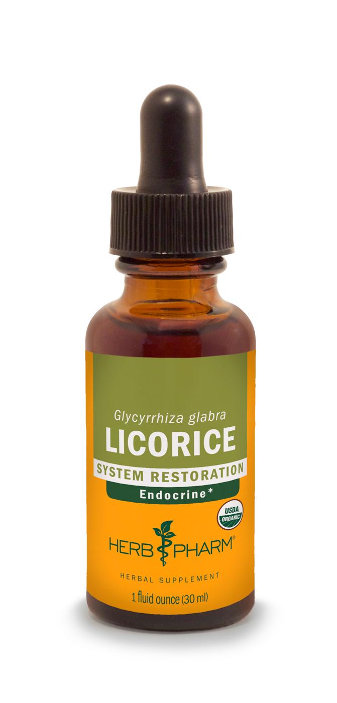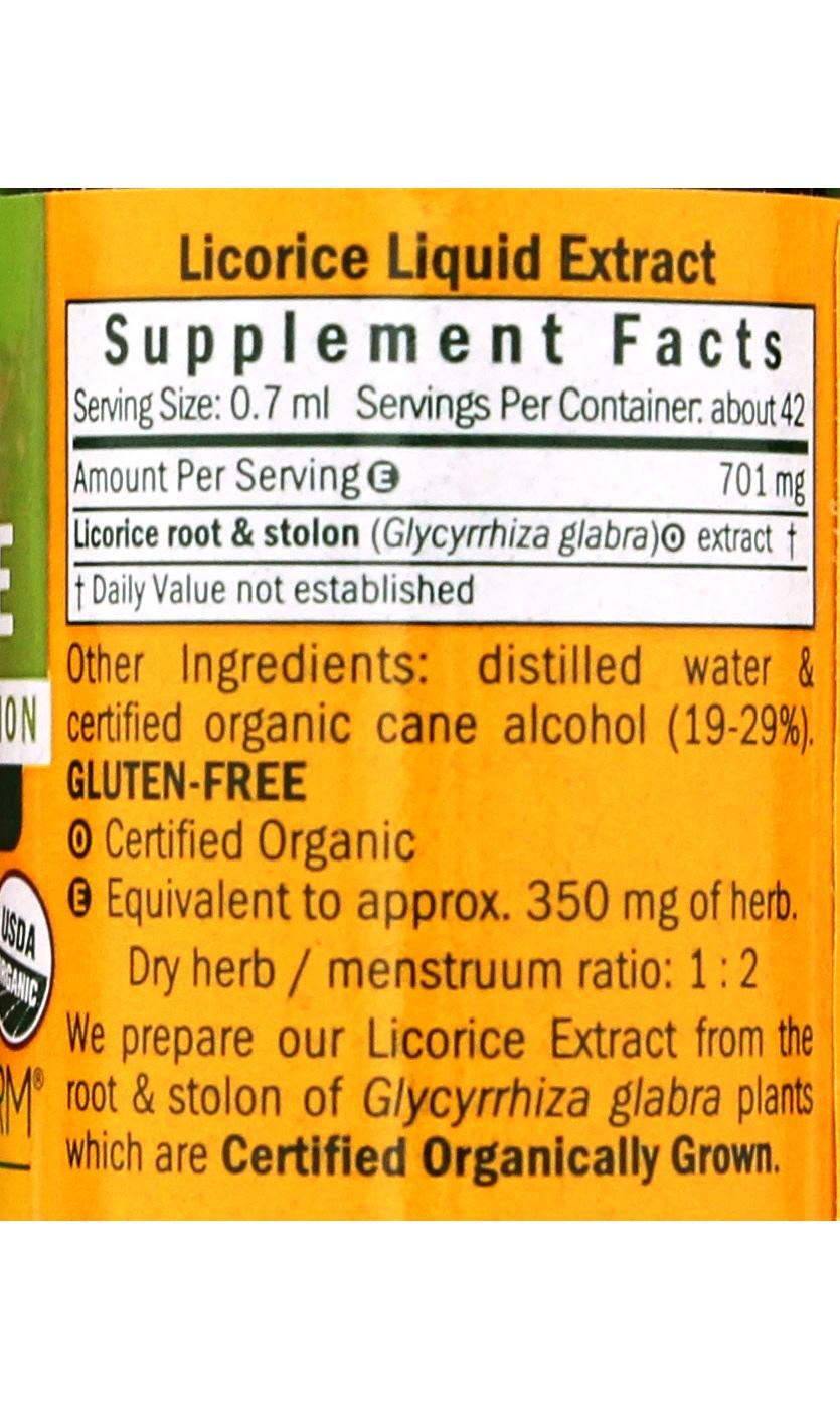 distilled water & certified organic cane alcohol (19-29%). Gluten-Free. Licorice - Glycyrrhiza glabraAllergens and safety warnings